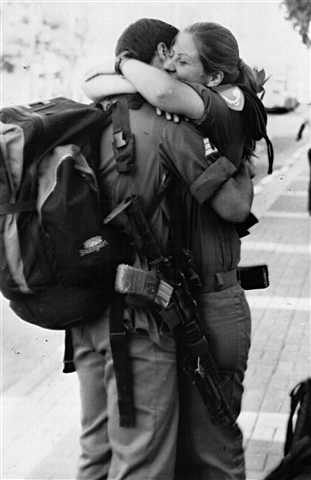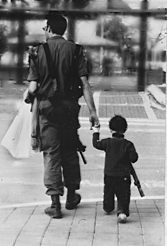 Поменяв место жительства, Киев на Афулу, Константин Красный и здесь нашел для себя источник вдохновения. Другие улицы, другие жизненные реалии нынче окружают его. Но сколько неожиданных и интересных кадров он смог снять на афульских улицах! Несколько фотографий из этого цикла особенно привлекли мое внимание. «Два бойца», так бы я назвала фото, на котором от нас удаляются молодой отец — резервист ЦАХАЛ’я с автоматом наперевес и его маленький сынишка, держащий игрушечный автомат, точно «как папа».