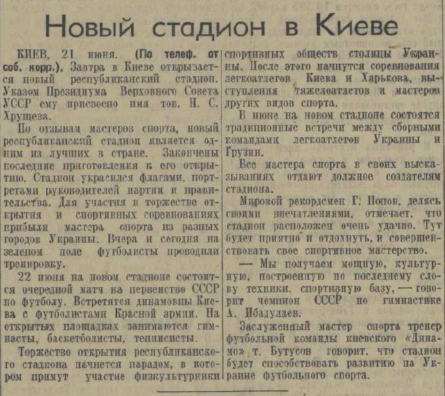 А назавтра в Киеве должен был состояться большой праздник — открытие нового республиканского стадиона. Все молодые парни маминого двора, ее брат Борис Бомштейн с другом Борисом Дымарским, братья Саша и Толя Радомысльские заранее купили билеты на футбольный матч между киевским «Динамо» и московским ЦДКА (так раньше назывался клуб ЦСКА).
