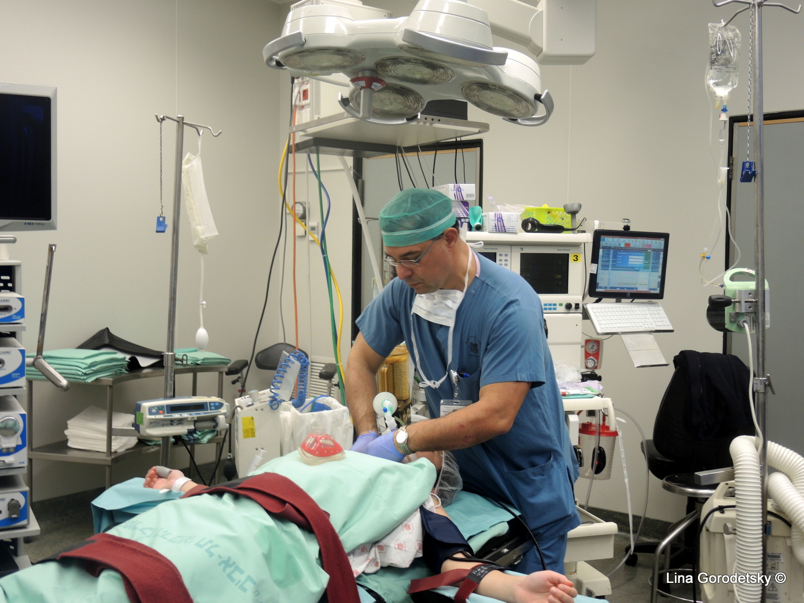Ребенка везут в операционную, мама идет рядом, так ему спокойней. Она сможет присутствовать с ним в первые минуты, перед наркозом. Как важно ей знать, что ребенок в надежных руках, что операция пройдет успешно. Не волноваться невозможно, но, думаю, легче стало на сердце матери, когда над ее сынишкой склонился старший анестезиолог, доктор Александр Сотман и предложил мальчику вместе надуть шарик. Ребенок заинтригованно принимает участие, не ведая, что шарик и есть первый его шаг к анестезии, к спокойному сну, благополучному исходу операции, которая проводится под общим наркозом, с применением ларингеальной маски, ингаляционными и внутривенными лекарственными средствами.
