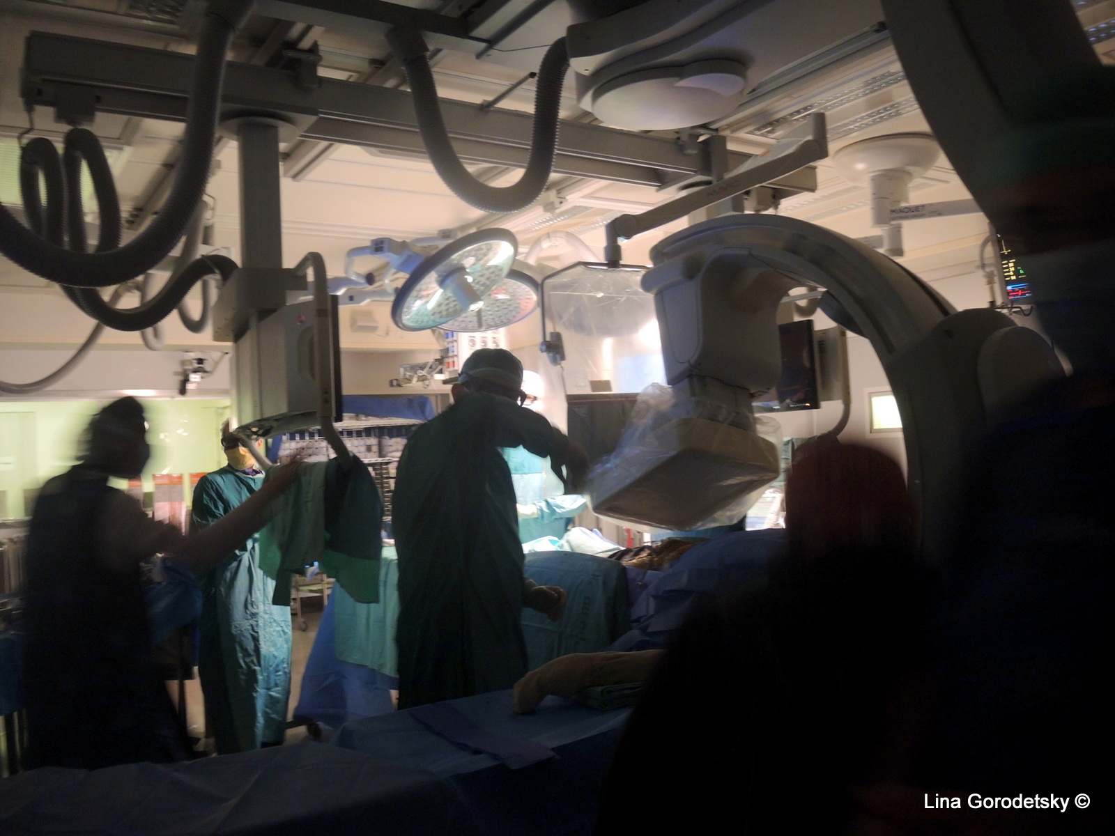В одиннадцатой операционной спасала человека бригада медиков во главе с профессором Вольфом, ведущим специалистом в сосудистой хирургии. У больного была обнаружена аневризма брюшного отдела аорты. От этой болезни скоропостижно скончался замечательный израильский певец Арик Айнштейн. Пациенту, находящемуся на операционном столе, повезло вовремя оказаться в больнице, его жизни была спасена. Своевременное эндоваскулярное введение стента в брюшную аорту в месте аневризмы предотвратило ее разрыв. Эта процедура выполняется сосудистыми хирургами под рентгеноконтролем и потому происходит в затемненной комнате, при свете ярких направленных прожекторов.