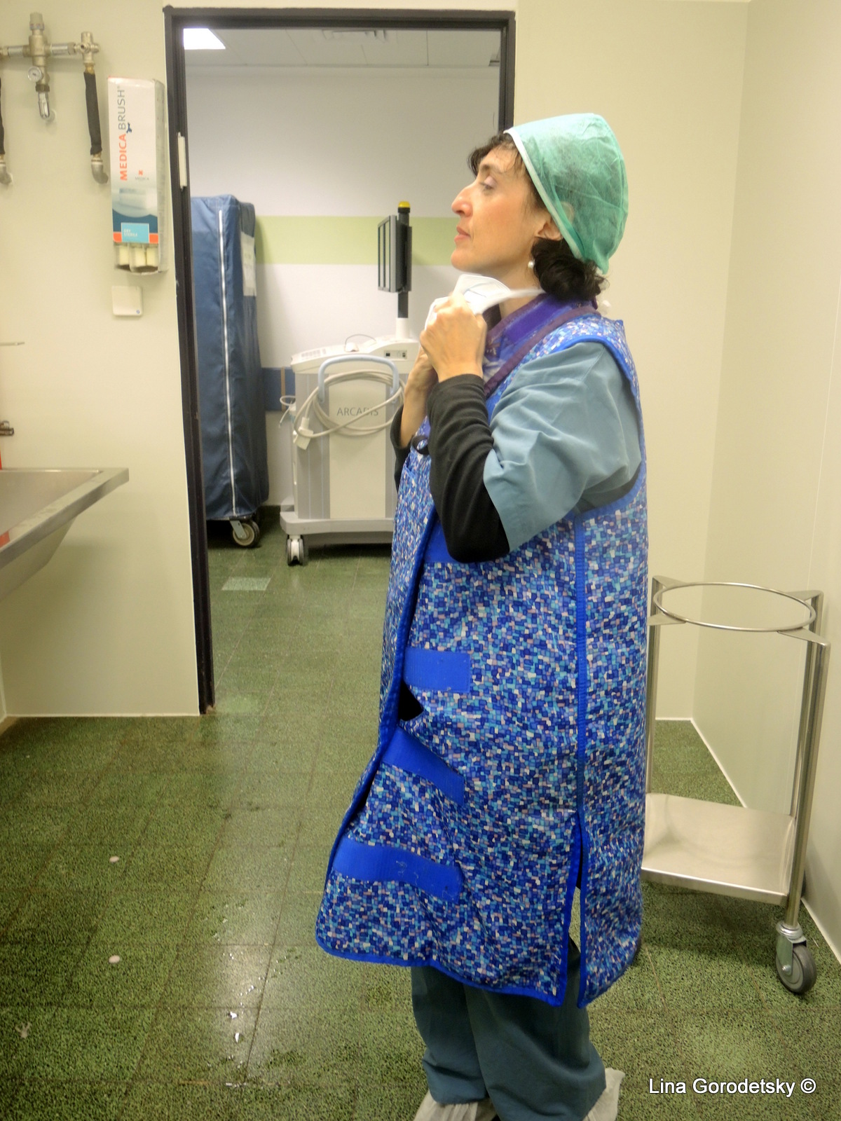 А всем медикам во время этой операции приходится работать в специальных очках и жилетах, защищающих от радиактивного излучения. Я тоже облачилась в эту одежду.