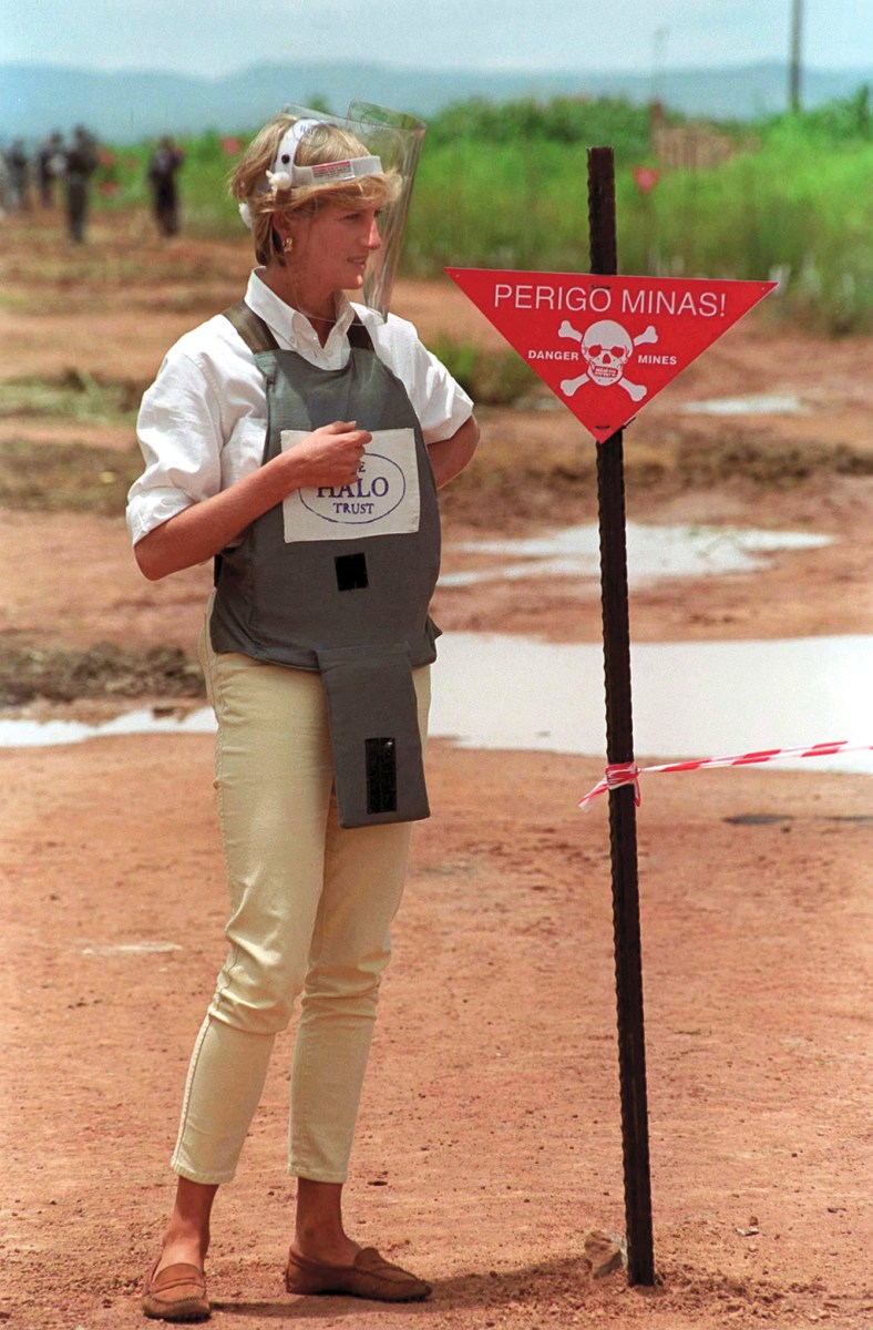 Diana Minefield HUAMBO, ANGOLA — JANUARY 15: Diana, Princess Of Wales, Visits A Minefield Being Cleared By The Charity Halo In Huambo, Angola, Wearing Protective Body Armour And A Visor. (Photo by Tim Graham Picture Library/Getty Images)