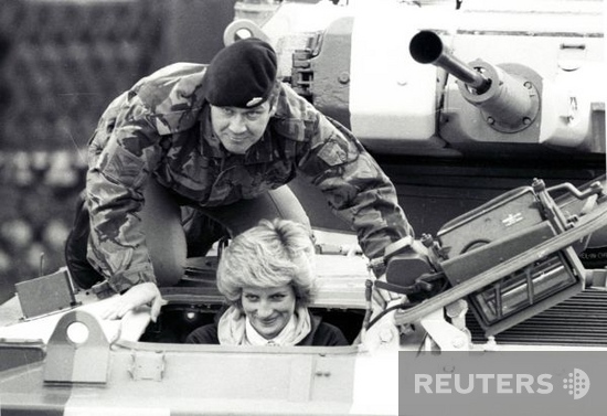 Princess Diana (L), sits in an armoured Fighting Vehicle on a visit to Wavell Barracks, the base of the Royal Hampshire Regiment, in Berlin on October 19, 1985. Colour Sargeant Jones is seen showing the Princess the controls before she drove the vehicle. REUTERS/Ulli Michel