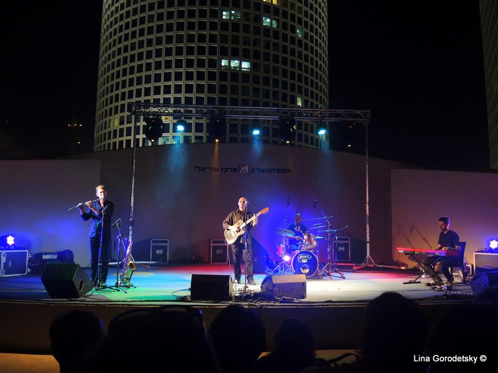 Уютный открытый зал чем — то напомнил мне летние концертные площадки, когда-то популярные в стране нашего исхода. Но здесь удивительной ауре способствует таинственная элегантность пейзажа, в который вписываются мерцающими окнами три яркие башни, символы Тель-Авива. Они располагаются прямо за сценой.