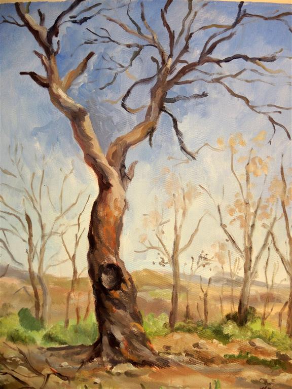 И дерево… Дерево с голыми ветвями не казалось мне мертвым, потому что вокруг него уже появилась первая робкая зелень. От того картина виделась менее трагической. Хотя я знала историю ее рождения. Это дерево с поднятыми к небу тонкими прутиками обнаженных веток было написано через несколько месяцев после трагического пожара на горе Кармель, во время которого погибли люди, и тяжело пострадала природа. Все еще было обуглено и пусто, когда Таня рисовала Кармельский лес. Но вот эти изумрудные травинки совершенно меняют фон, оставляя надежду, что он вновь оживет. И он вернулся к жизни…