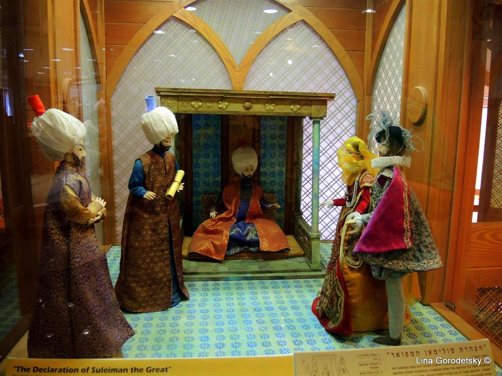 А главная изюминка ждет на втором этаже, где находится музей, в котором главные экспонаты – куклы в исторических костюмах. Проходя мимо освещенных витрин, в которых они расположены, мы совершаем путешествие в прошлое, во времена Донны Грации и проживаем с нею ее судьбу. Маленькие сюжеты ее большой жизни, вехи истории евреев средних веков. Тайное бракосочетание по еврейским законам, инквизиторы за работой, принятие королевской четой Испании – Фердинандом и Изабеллой приказа о требовании насильственного перехода евреев в христианство, встречи Донны Грации с императорами, передача ей первого экземпляра «Феррарской Библии».