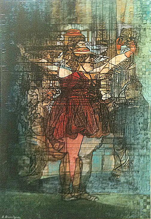 Приятно увидеть на выставке изящные женские полотна. Работа Ирины Сорочинской из серии «На черной бумаге» не имеет конкретного названия. Это полет фантазии художницы, сумевшей посредством использования различной техники на бумаге воплотить свои чувства, ассоциации, размышления о прекрасном. Оффорт, гравюра, пастель, коллаж, все неожиданно смешалось и выразило представления художницы о красоте мира. Сама Ирина говорит, что в этой работе главную роль играет авторская техника. Она рада, что смогла через нее передать свои фантазии. Ну что же, посетителю будет, о чем поразмышлять, глядя на черную бумагу под стеклом. Можно представить некое многоцветное кружево удивительной формы, или сказочную птицу. Впрочем, в картинах художников всегда должна быть загадка.