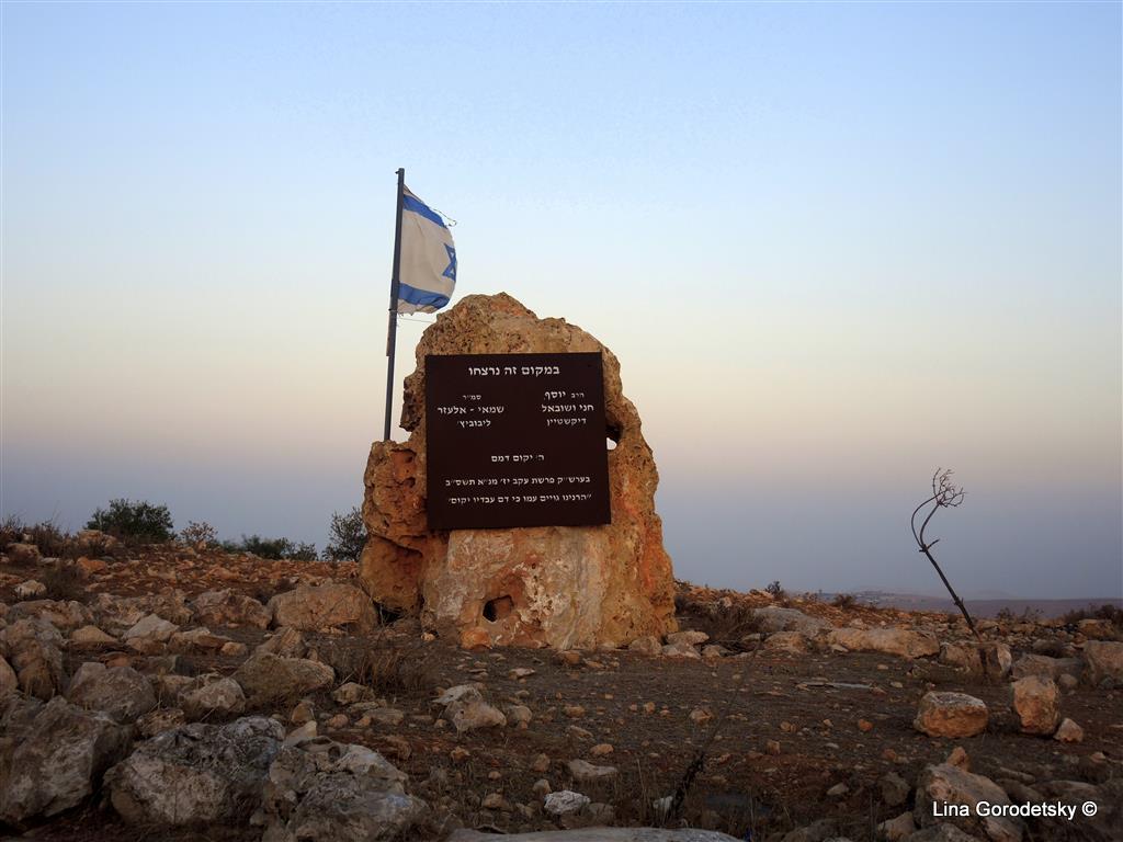 Я сфотографировала его вблизи от камня, установленного в память о жертвах теракта, произошедшего  на этом месте. В тот июльский день 2002 года, в упор были расстреляны Йосеф-Яаков Дикштейн,  Хана Дикштейн, их сын десятилетний Шуваэль Дикштейн. Девять детей остались сиротами. В тот же день погиб в машине и двадцатилетний Элазар Лейбович, солдат ЦАХАЛА.