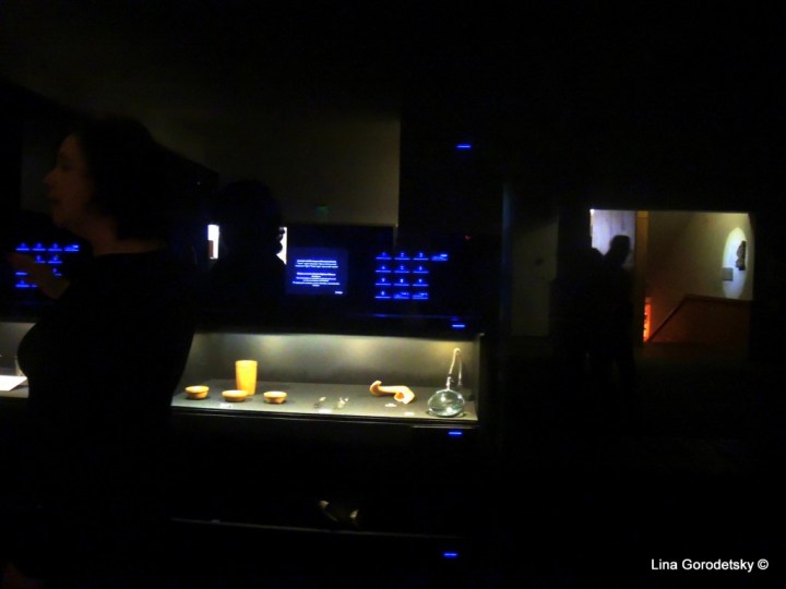 Одним нажатием руки открываются освещенные стеллажи, а там – собранные семейные реликвии. Достаточно нажать на номер-код, и высвечивается рассказ о чудом сохранившихся вещах прошлого. Это фотографии, дневники, молитвенные принадлежности.