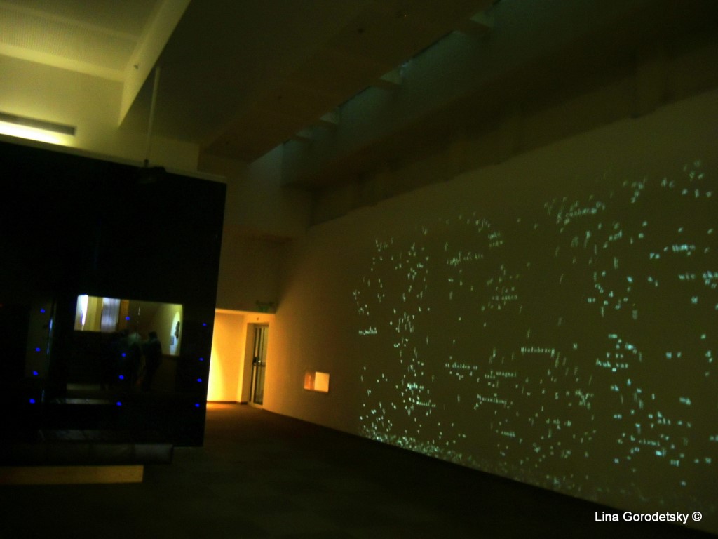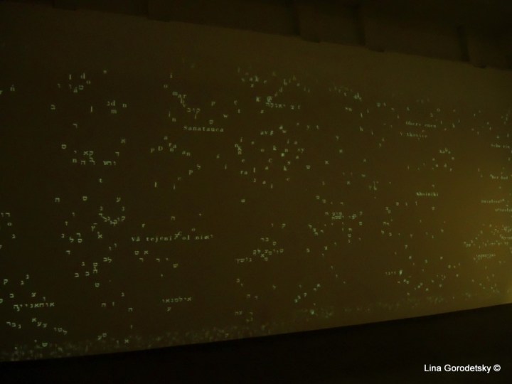 Но вдруг на центральной стене-экране появляются точечки букв, затем эти мерцающие точки складываются в слова, и мы читаем названия…. Четыре тысячи семьсот больших городов и маленьких «штетлов», в которых бурлила до войны еврейская жизнь. А затем сложенные слова распадаются на сотни звездочек и уходят с экрана. Так же, как улетели в небо несбывшиеся мечты людей, проживавших в этих городах.