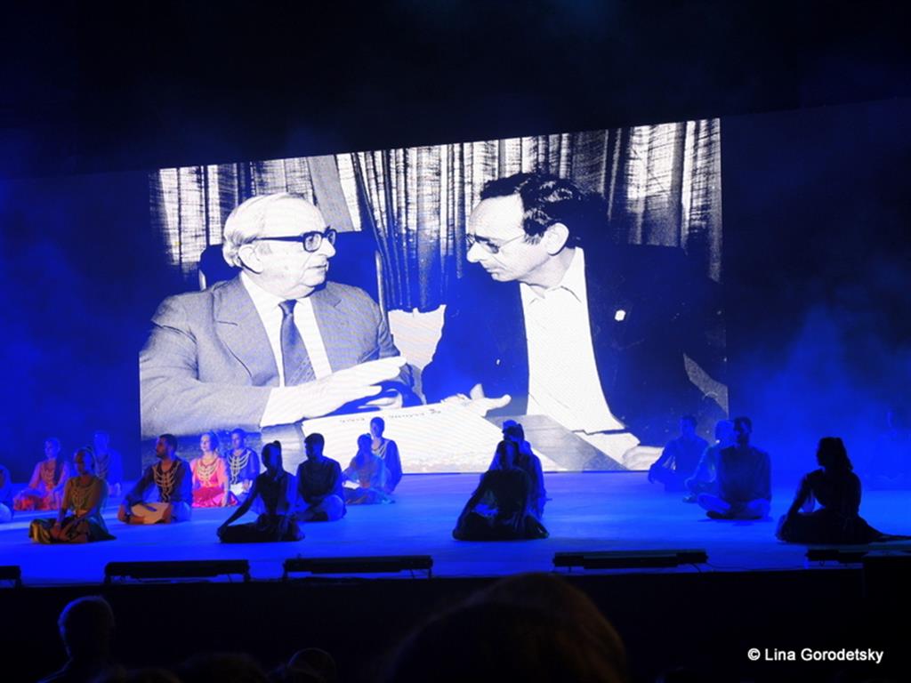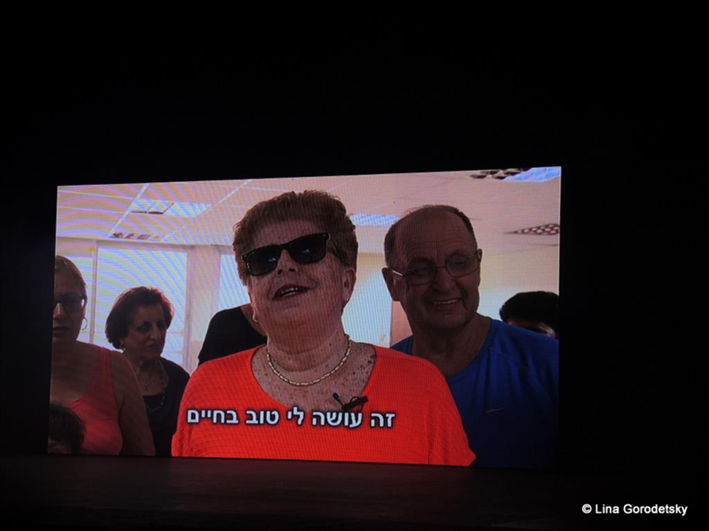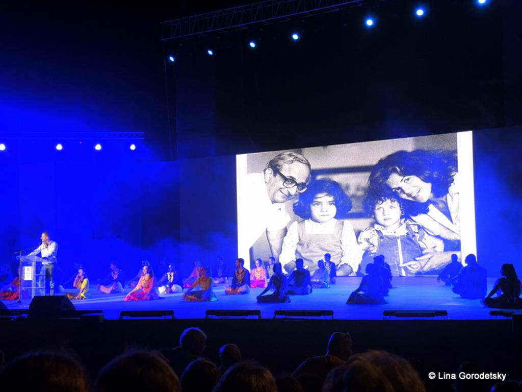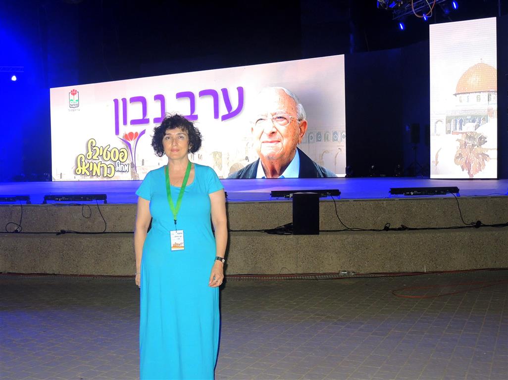 Вели концерт отличные артисты Йорам Гаон и Галит Гиат. Ее вы видите на фотографии выше, на большом экране, женщина с платком в красной кофточке, Галит играет одну из главных ролей в спектакле «Бустан Сфаради». А на открытии фестиваля она рассказала,  как волновалась, когда впервые предстала перед драматургом и как он одобрил ее на эту роль.