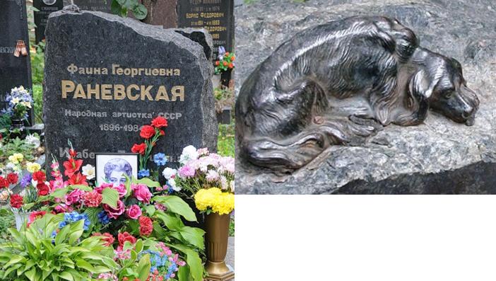 Она похоронена рядом с сестрой, на Донском кладбище. А не Новодевичьем, где в ту пору было принято хоронить известных людей. Так завещал Раневская. Но поклонники силы ее мастерства находят ее могилу,  десятки людей ежедневно приходят поклониться с живыми цветами. А на верхушке памятника — маленькая бронзовая собачка. В память о Мальчике, который пережил свою хозяйку…