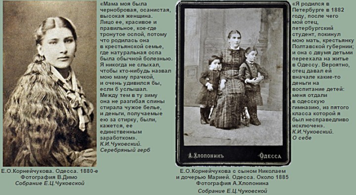Да и детство не радовала этого большого улыбчивого человека, любимца детворы. Не стал он желанным внуком у деда, известного врача Соломона Михайловича Левенсона, выпускника Берлинского университета, и потомственного почётного гражданина, что для евреев было редкостью. Двадцатидевятилетний Эммануил Левенсон, в доме которого работала прислугой мама поэта, так и не связал семейные узы с ней, хотя родились от этой связи двое детей. А вскоре после рождения Николая, когда отец оставил незаконную семью и женился на другой более подходящей ему по положению женщине и с ней переехал в Баку, мать Чуковского уехала из Санкт-Петербурга в Одессу.