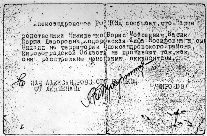 Как только была освобождена Александровка, мои родители: отец с фронта, а мать из Ленинграда, где она работала всю блокаду, стали разыскивать меня и родственников. Ответ из Александровского отдела НКВД утверждал, что я и все родственники расстреляны. Могу себе представить, что пережили мои родители, получив такой ответ. На наше счастье, командир проходившей военной части написал обо мне в газету и это письмо было зачитано по радио. Так моя мать узнала, что я жив.»