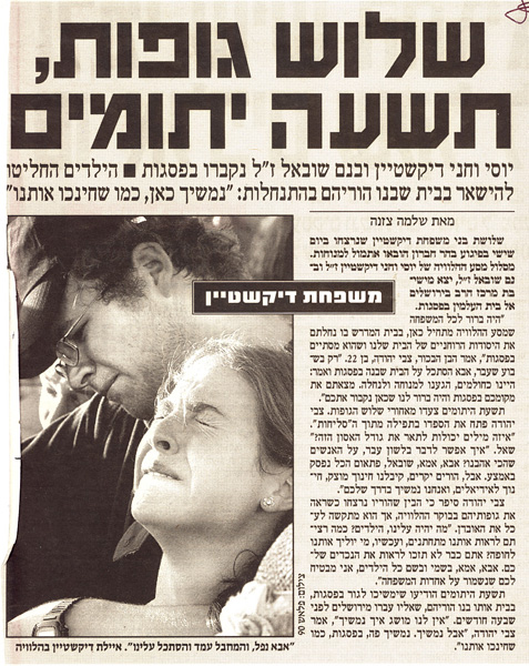 26 июля 2002 года была пятница, и семья Дикштейн отправилась в гости к близким друзьям. Теракт на дороге на юге Хевронского нагорья, в том месте, где теперь стоит сфотографированный мною памятник ( но об этом позже), произошел незадолго до начала шабата.