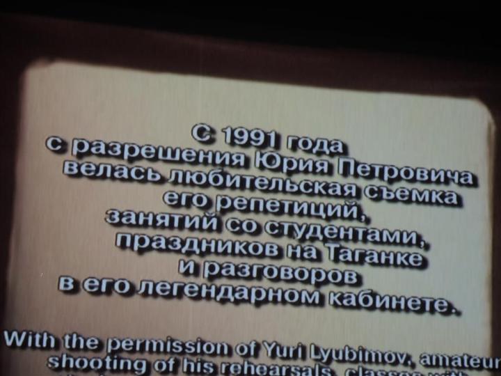 А основной частью программы вечера стал премьерный показ фильма о Юрие Петровиче, куда вошли уникальные кадры. Фильм родился из любительских съемок, которые в течение многих лет делала Светлана Сидорина. Она была рядом с режиссером и смогла запечатлеть его во время репетиций, его беседы, монологи.