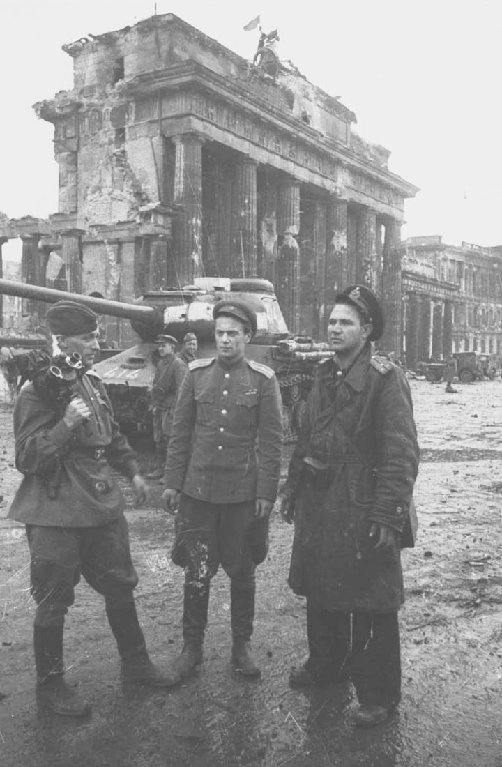 Женя почти сразу узнал об этом…Ему было суждено пройти всеми дорогами войны, дойти до Берлина. На этой фотографии: Роман Кармен, Евгений Долматовский и Евгений Халдей у Бранденбургских ворот. 2 мая 1945.