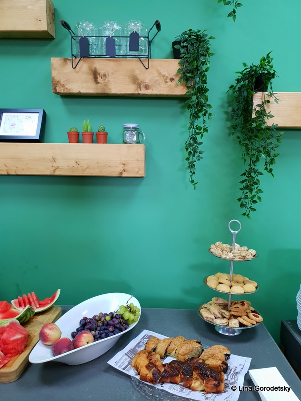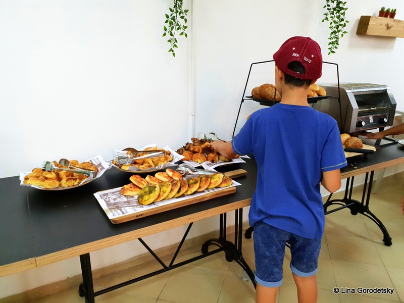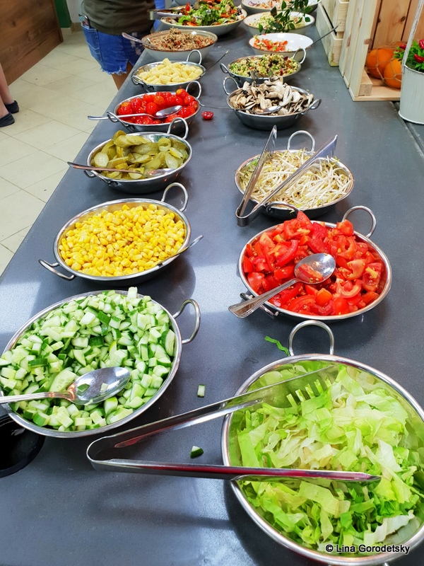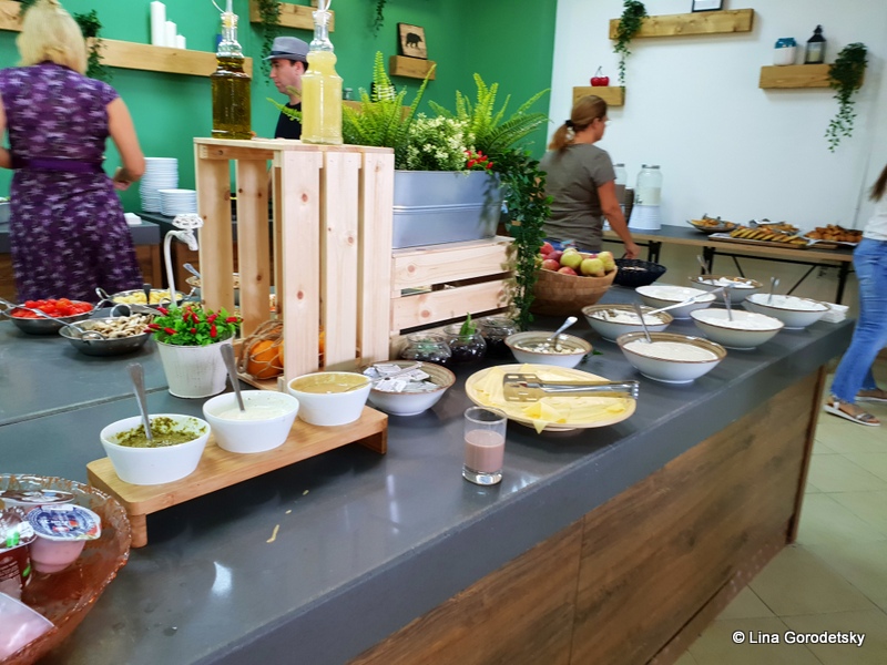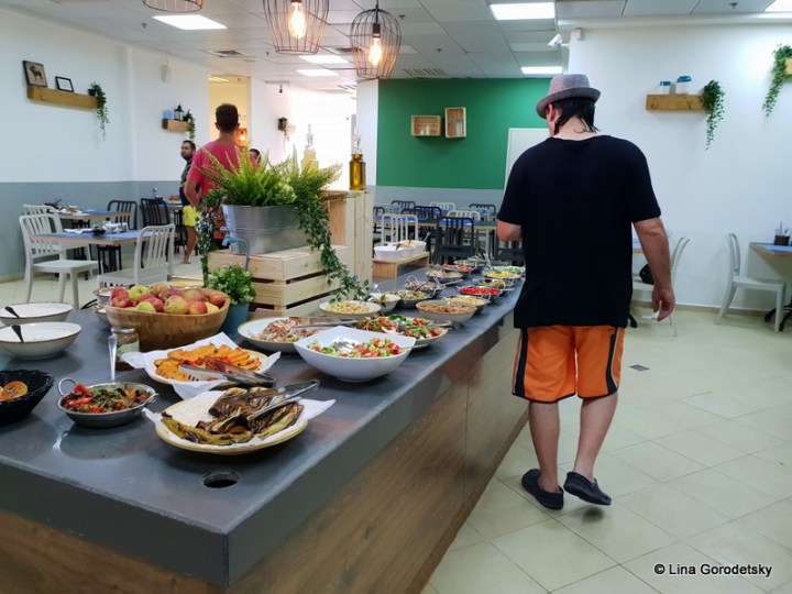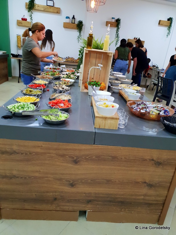 Завтрак, как в каждой израильской гостинице, очень разнообразный, я бы даже сказала, что разнообразней среднестатистического, ибо кроме традиционного овощного салата, в ассортименте присутствуют салаты необычные и очень вкусные.