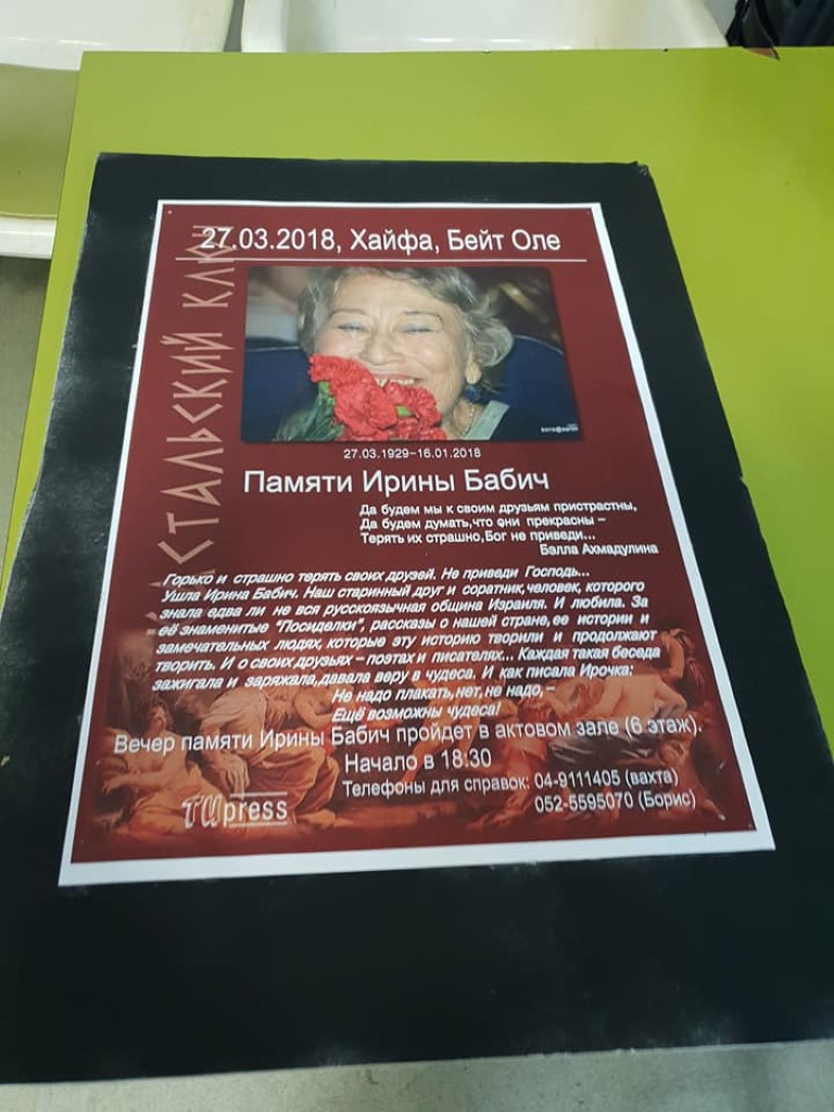 16 января  2018 года ушла Ирина Борисовна Бабич. Яркий журналист, автор поэтических строк, рассказов для детей. Автор передачи на радио «Рэка» и собственного проекта «Посиделки», который она вела многие годы в Хайфе. Она тяжело болела в последнее время. Несколько инсультов нарушили здоровье этой необыкновенно энергичной, жизнелюбивой женщины. В последний раз, когда я звонила к ней, поняла, что она не узнает меня. Разговаривает, общается, но не узнает.