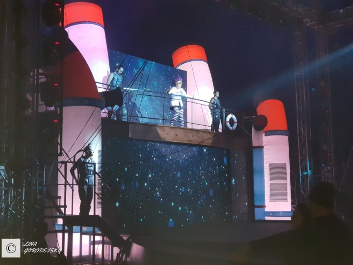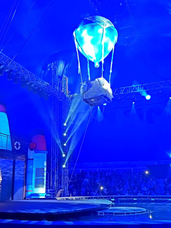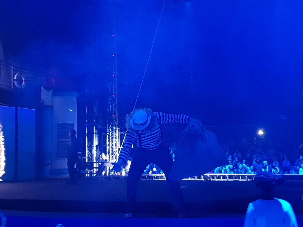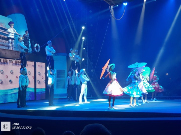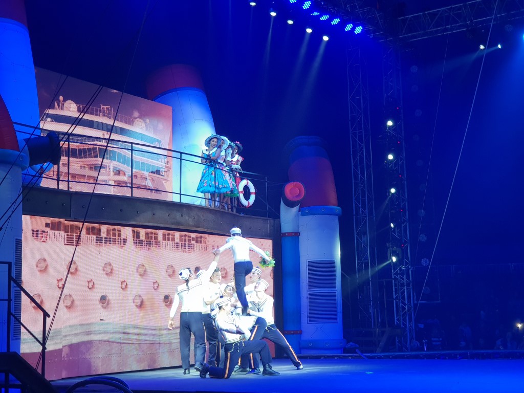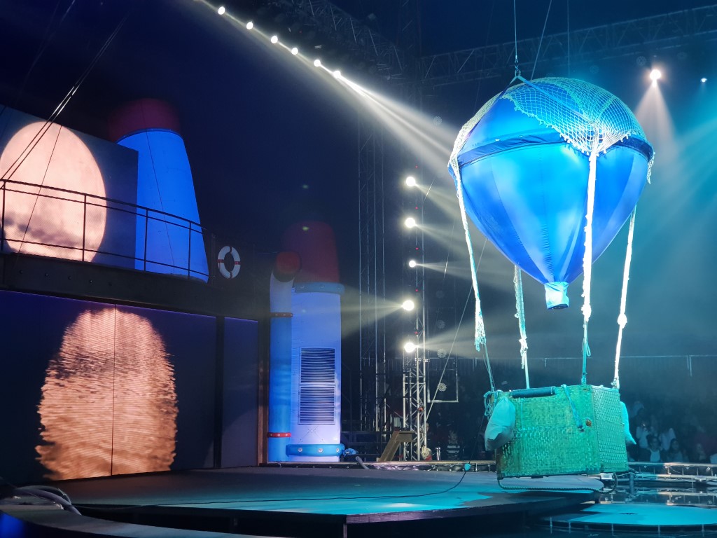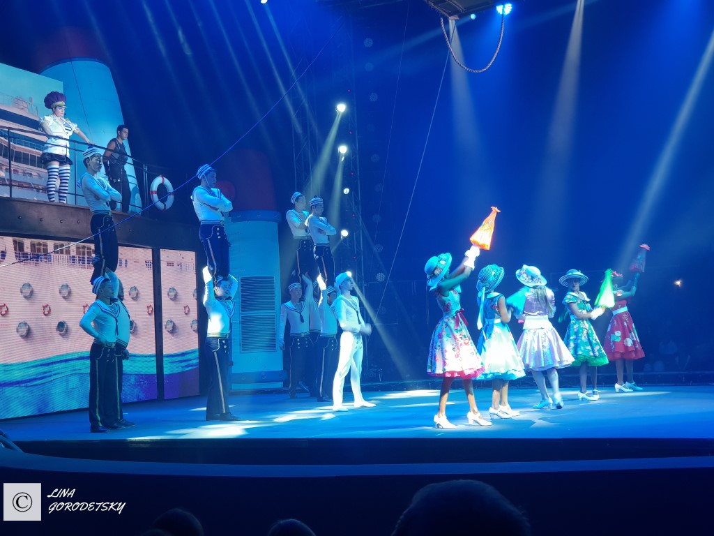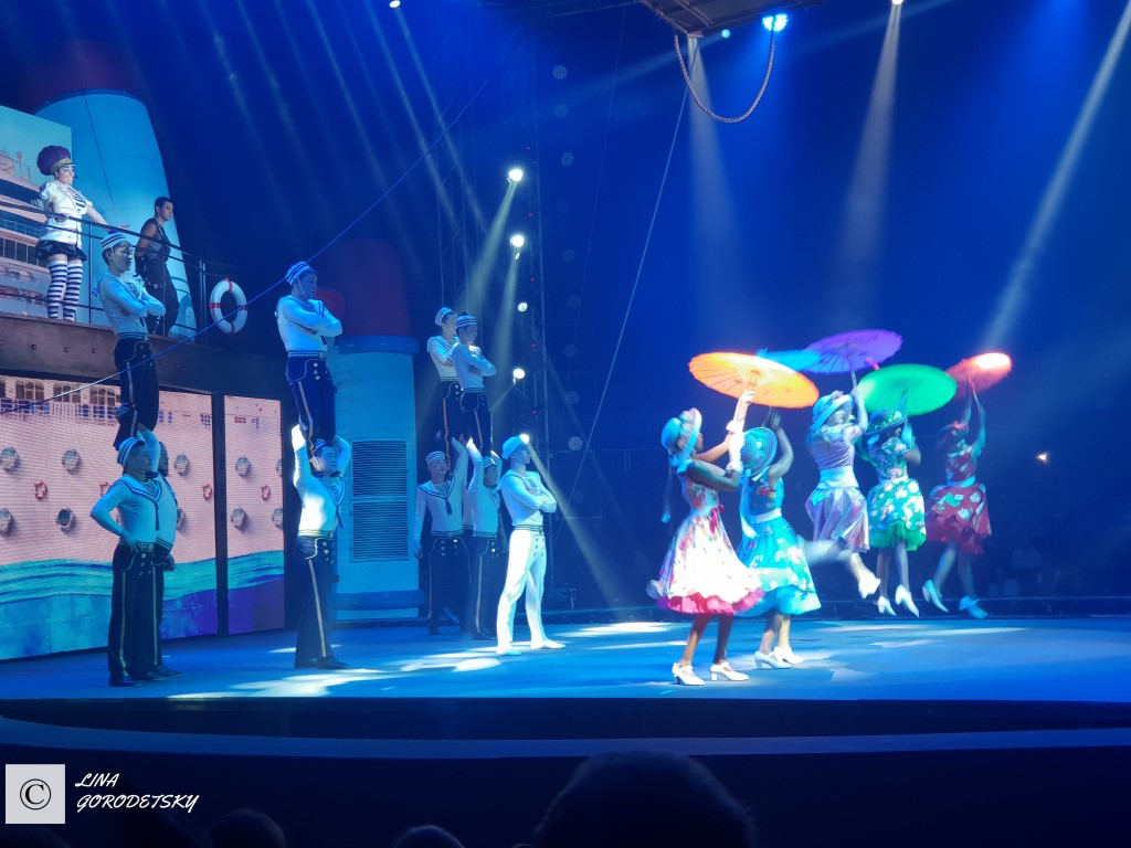 Симпатичные клоуны разнообразили действие, создавая очень живые и яркие миниатюры. Известно ведь, что настоящий клоун должен быть и акробатом, и жонглером, и совершенным мимом. Никаких дрессированных зверюшек, как было принято в нашем детстве. Ни львов, ни собачек… Но, оказывается, цирковая программа может быть разнообразной и без них. Главное — высокое мастерство! Вся программа идет в сопровождении хорошей музыки и отличных видеоэффектов. И воды! Да, совершенно неожиданно, вы оказываетесь пассажирами корабля и отправляетесь в морской круиз. Большинство цирковых номером сопровождались водными эффектами, прямо на сцене струились цветные фонтаны, и все представление было построено, как музыкальный спектакль, в котором главным действием были цирковые номера., Поставил это цирковое шоу постановщиком главный художник и режиссер театра «Гешер» Михаил Краменко, известный своими постановками также в театрах «Маюмана» и «Алюминиум-Шоу».