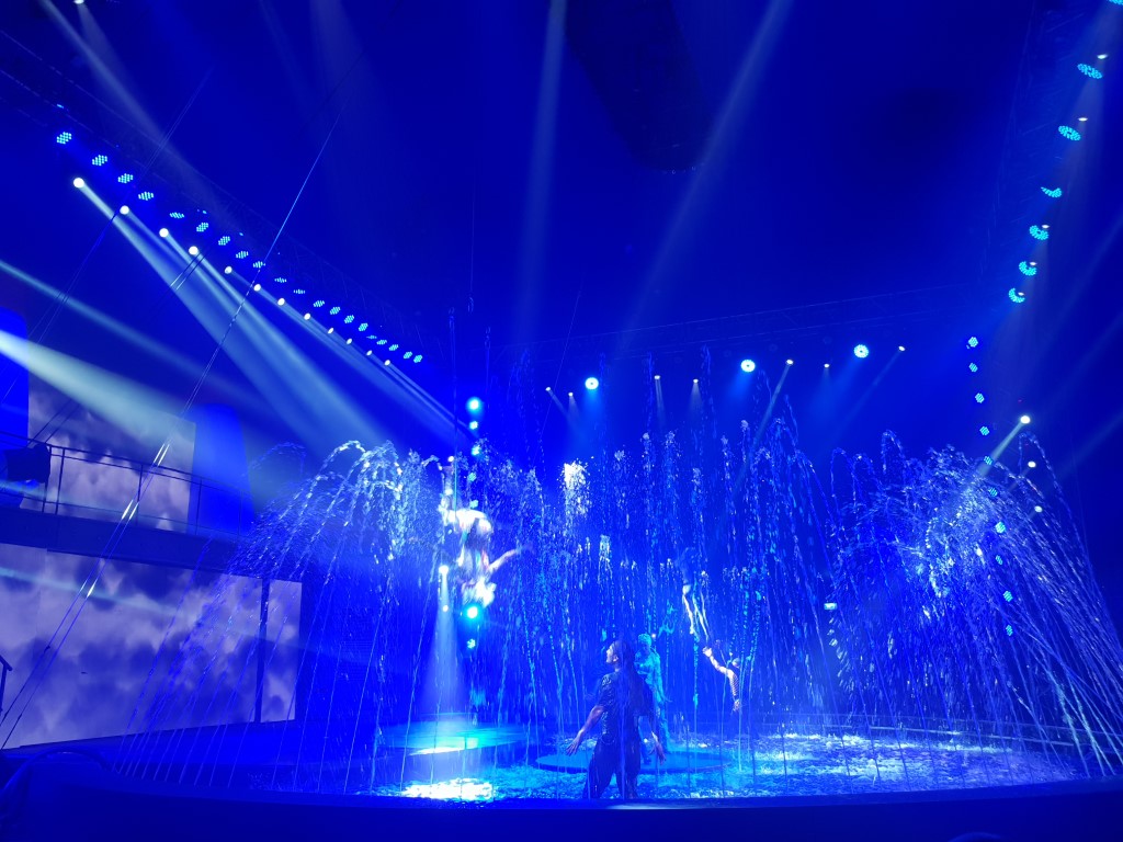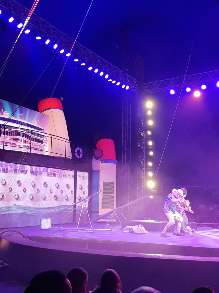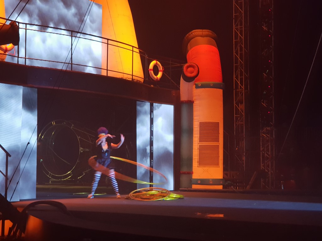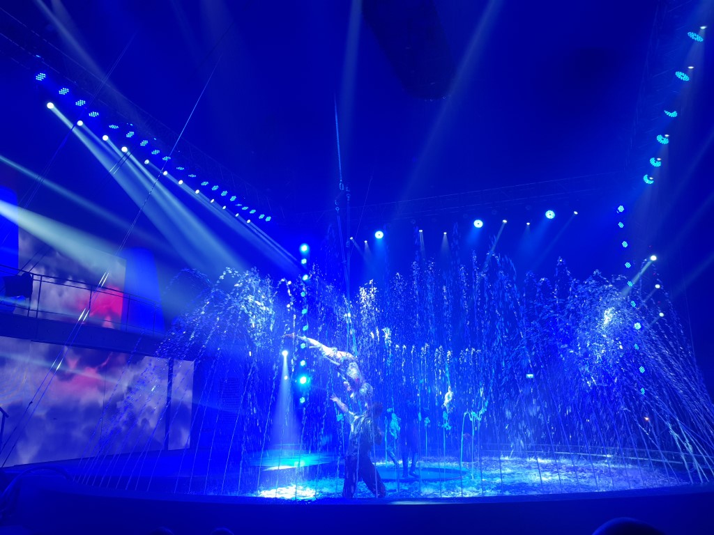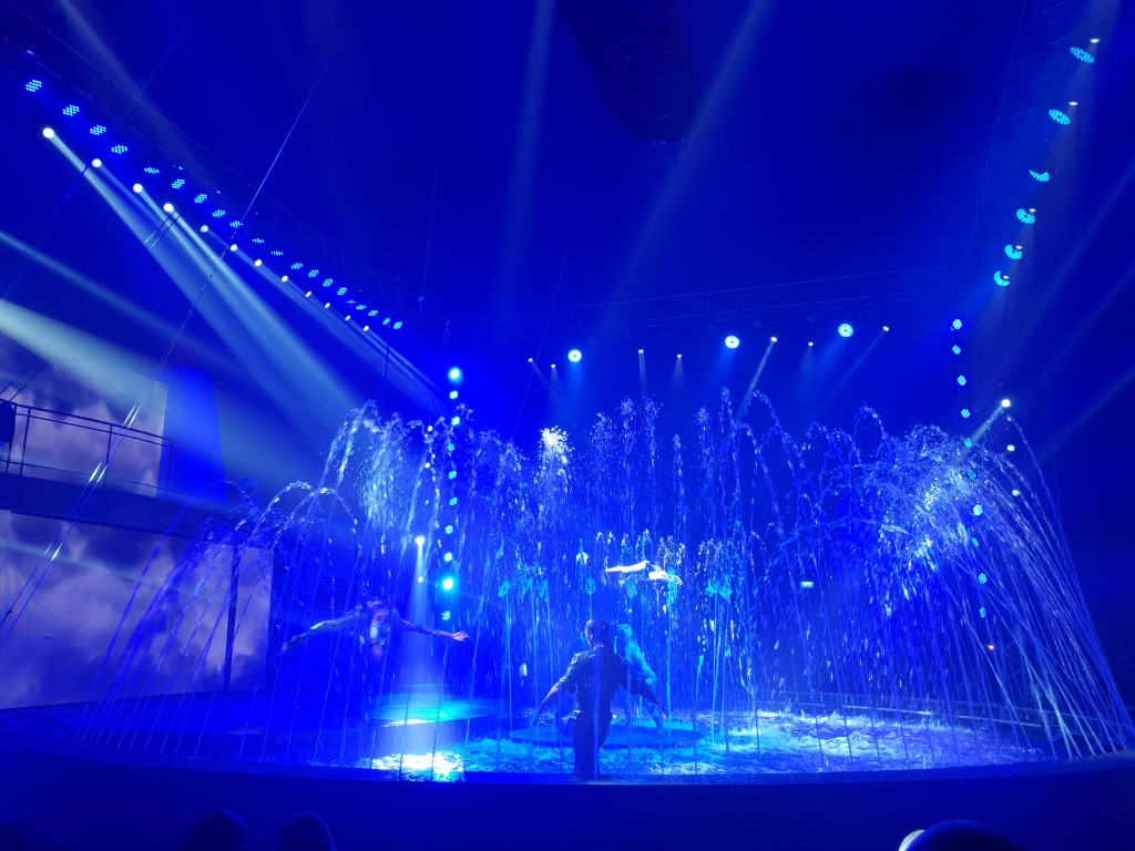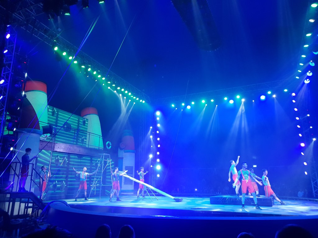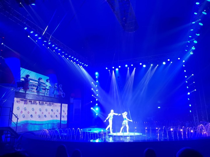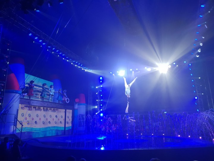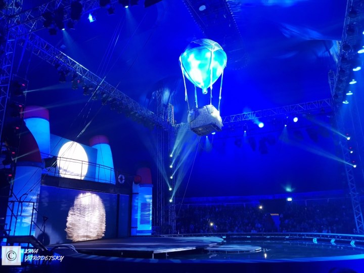 Симпатичные клоуны разнообразили действие, создавая очень живые и яркие миниатюры. Известно ведь, что настоящий клоун должен быть и акробатом, и жонглером, и совершенным мимом. Никаких дрессированных зверюшек, как было принято в нашем детстве. Ни львов, ни собачек… Но, оказывается, цирковая программа может быть разнообразной и без них. Главное — высокое мастерство! Вся программа идет в сопровождении хорошей музыки и отличных видеоэффектов. И воды! Да, совершенно неожиданно, вы оказываетесь пассажирами корабля и отправляетесь в морской круиз. Большинство цирковых номером сопровождались водными эффектами, прямо на сцене струились цветные фонтаны, и все представление было построено, как музыкальный спектакль, в котором главным действием были цирковые номера., Поставил это цирковое шоу постановщиком главный художник и режиссер театра «Гешер» Михаил Краменко, известный своими постановками также в театрах «Маюмана» и «Алюминиум-Шоу».