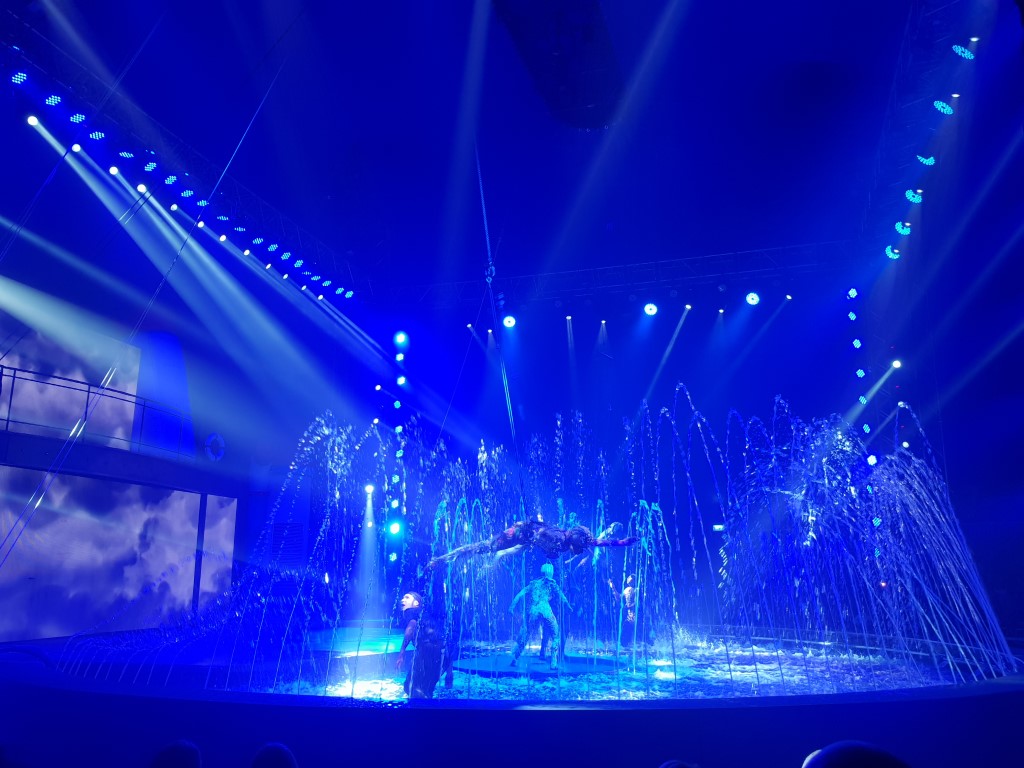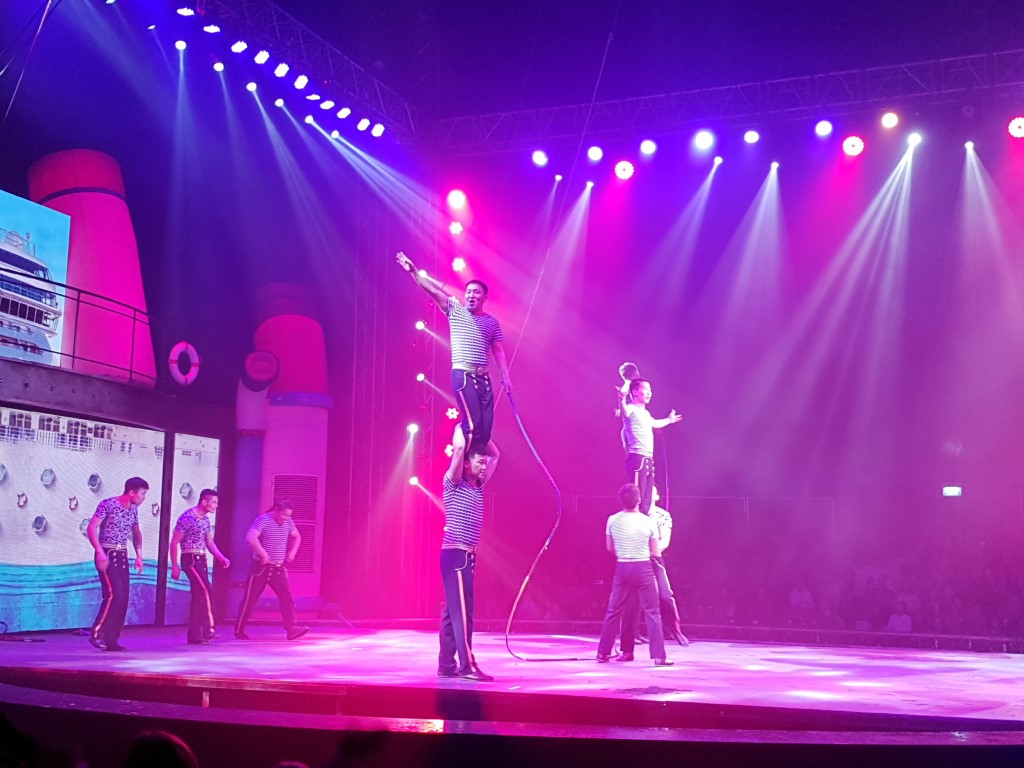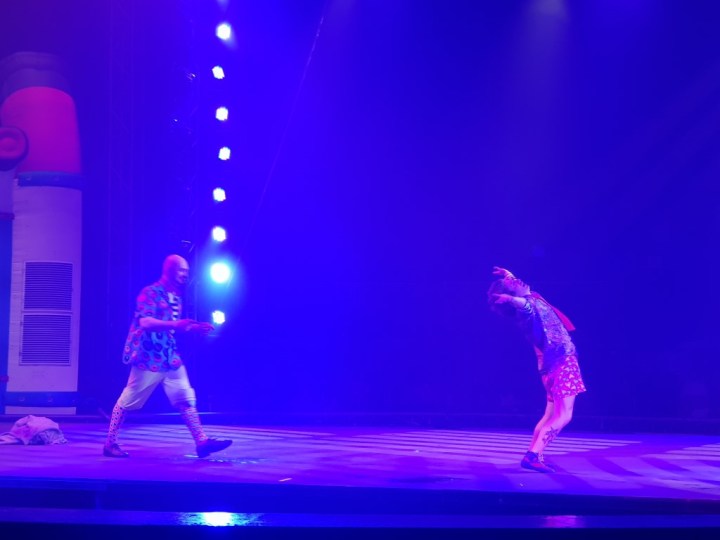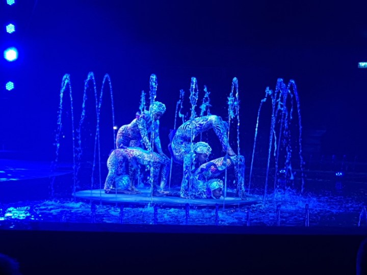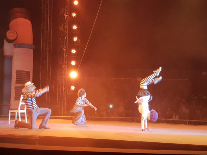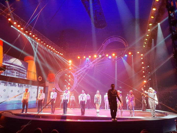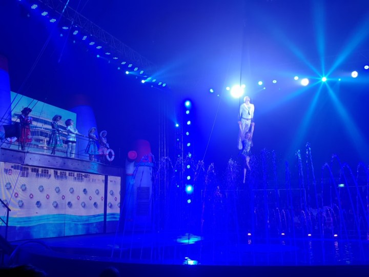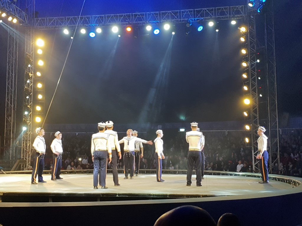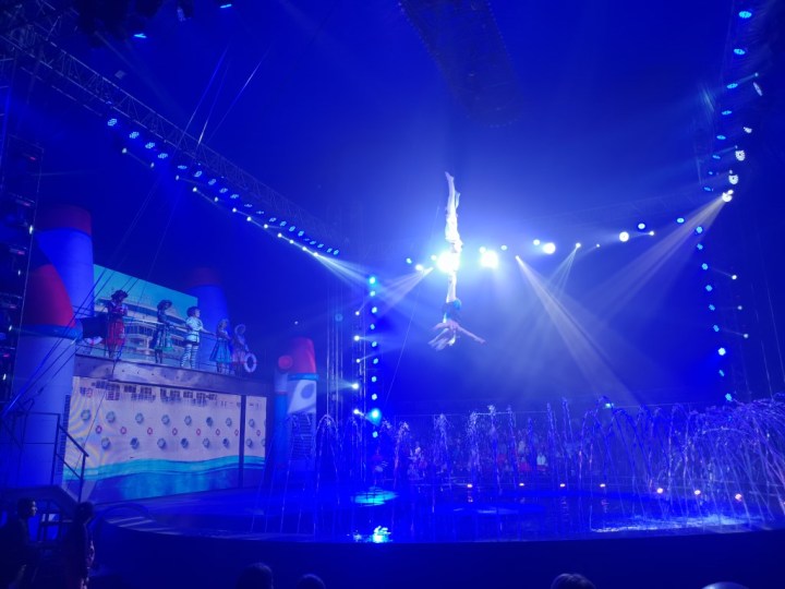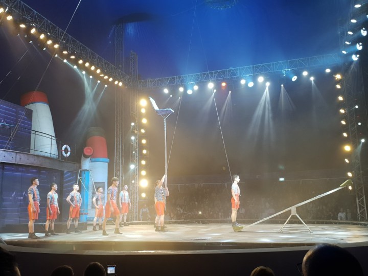 Симпатичные клоуны разнообразили действие, создавая очень живые и яркие миниатюры. Известно ведь, что настоящий клоун должен быть и акробатом, и жонглером, и совершенным мимом. Никаких дрессированных зверюшек, как было принято в нашем детстве. Ни львов, ни собачек… Но, оказывается, цирковая программа может быть разнообразной и без них. Главное — высокое мастерство! Вся программа идет в сопровождении хорошей музыки и отличных видеоэффектов. И воды! Да, совершенно неожиданно, вы оказываетесь пассажирами корабля и отправляетесь в морской круиз. Большинство цирковых номером сопровождались водными эффектами, прямо на сцене струились цветные фонтаны, и все представление было построено, как музыкальный спектакль, в котором главным действием были цирковые номера., Поставил это цирковое шоу постановщиком главный художник и режиссер театра «Гешер» Михаил Краменко, известный своими постановками также в театрах «Маюмана» и «Алюминиум-Шоу».