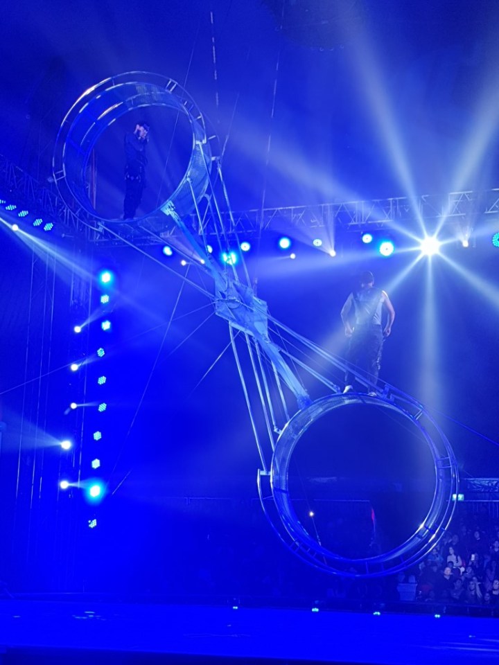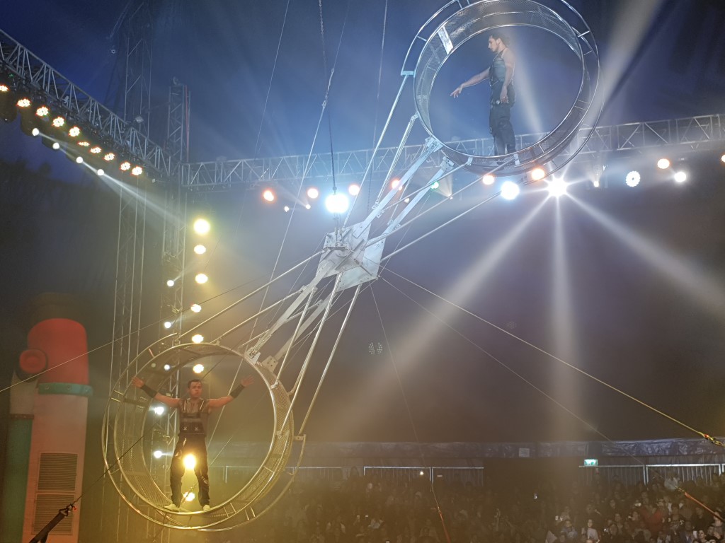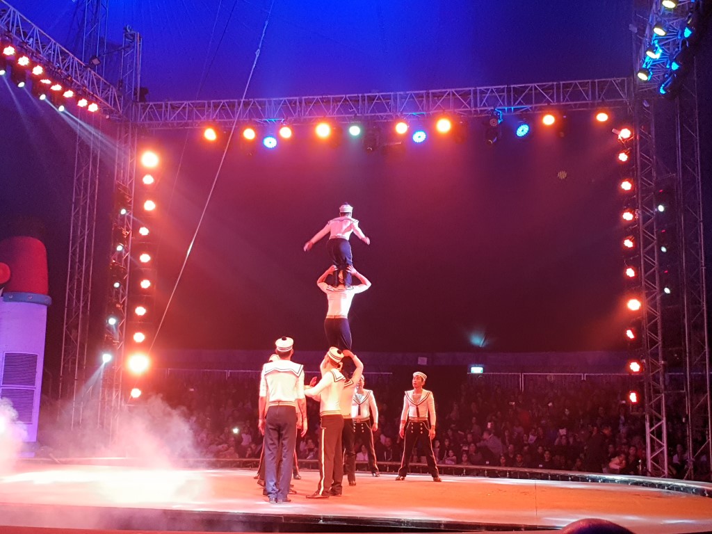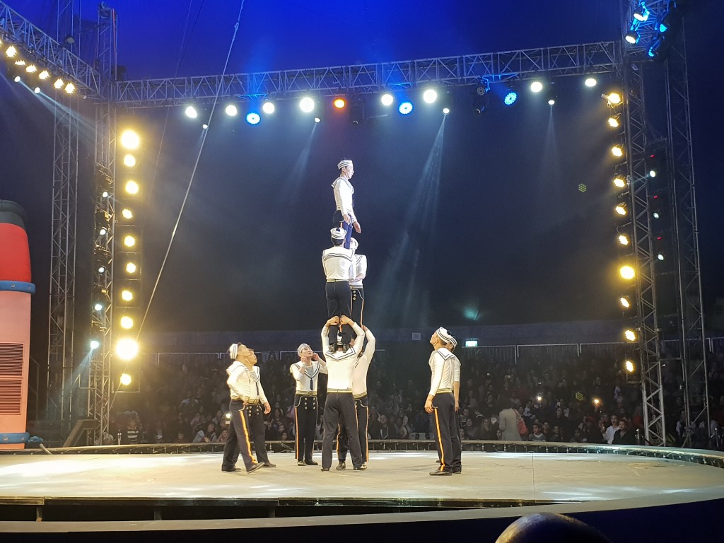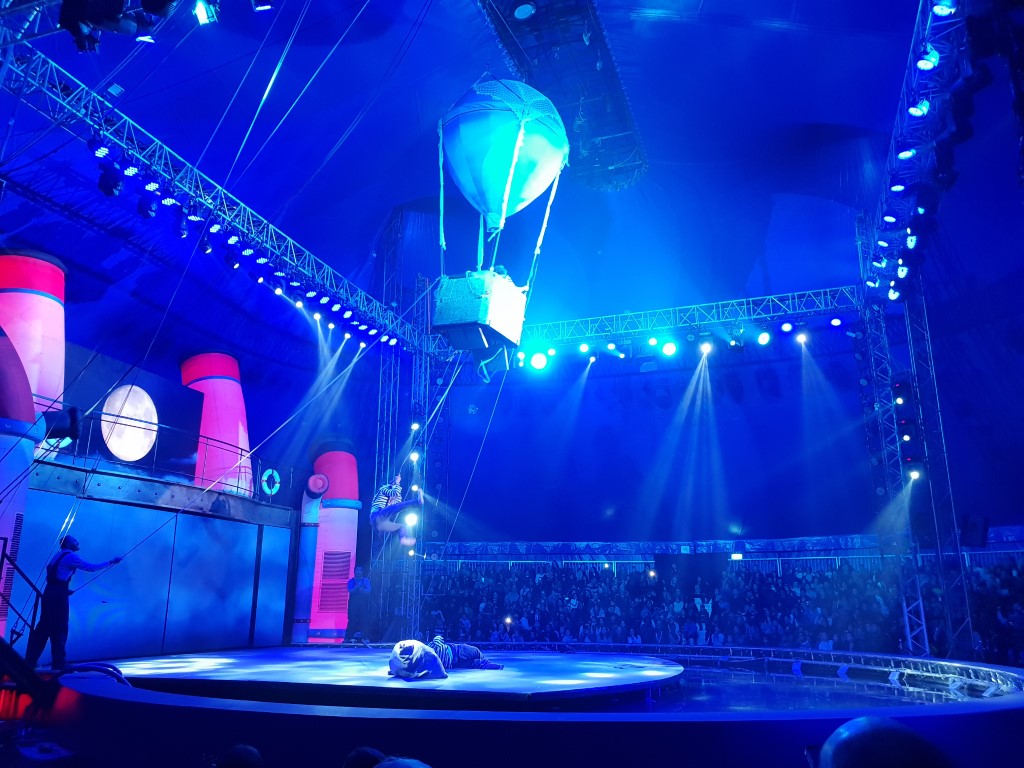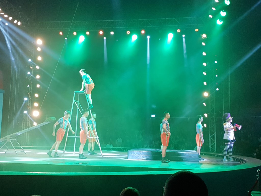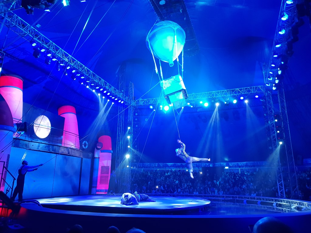 Клоунада, акробатика, эквилибристика, жонглирование, музыкальная эксцентрика, иллюзионизм, пантомима, все присутствует в большой новой программе . Два полных часа она идет, в середине — небольшой перерыв, чтобы сбросить напряжение в зрительном зале, которое растет от номера к номеру, особенно это касается, конечно, многочисленных акробатических номеров, хождение по канату, воздушную гимнастику. Эти номера проходят без страховки и надо обладать высочайшим секретом мастерства, чтобы спокойно, с неизменной улыбкой такой номер выполнить. Конечно, на бис. Причем и дети и взрослые не жалели ладоши. И я лично очень радовалась и успокаивалась, когда артисты уже спускались на землю.