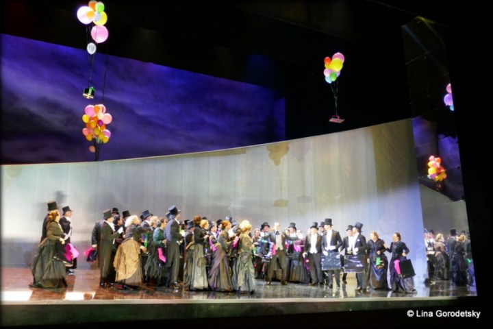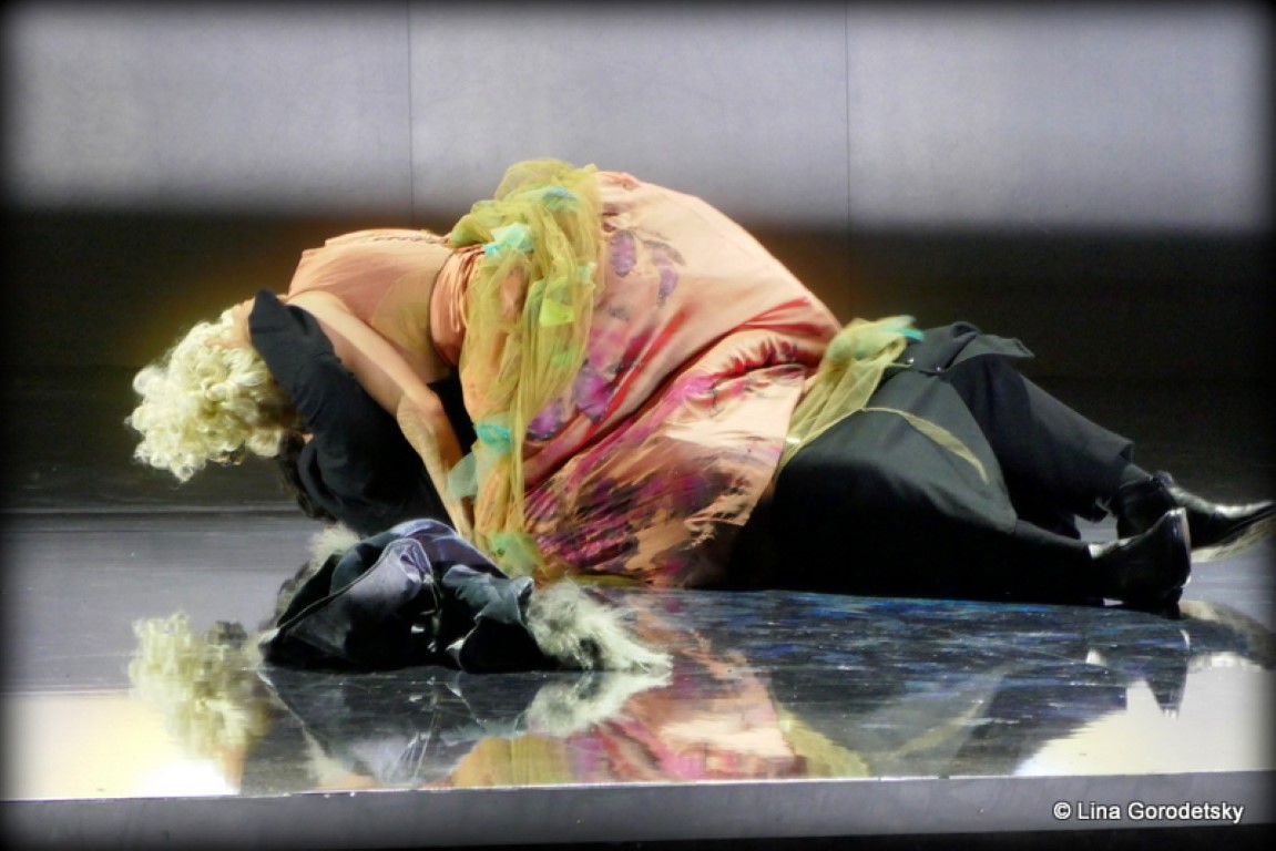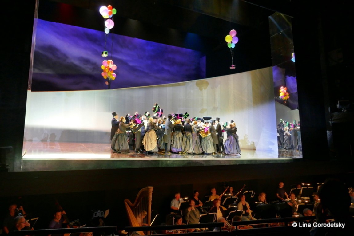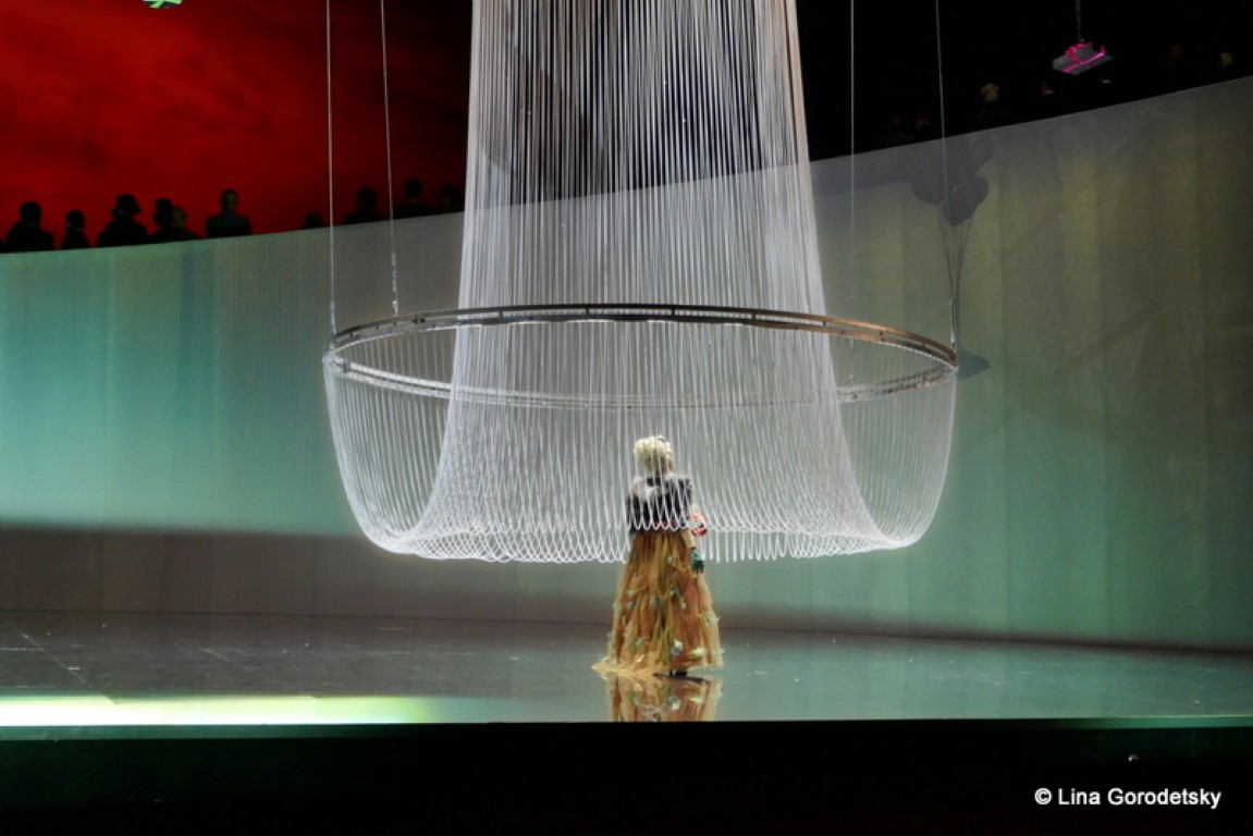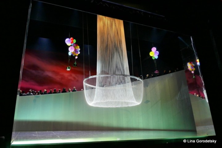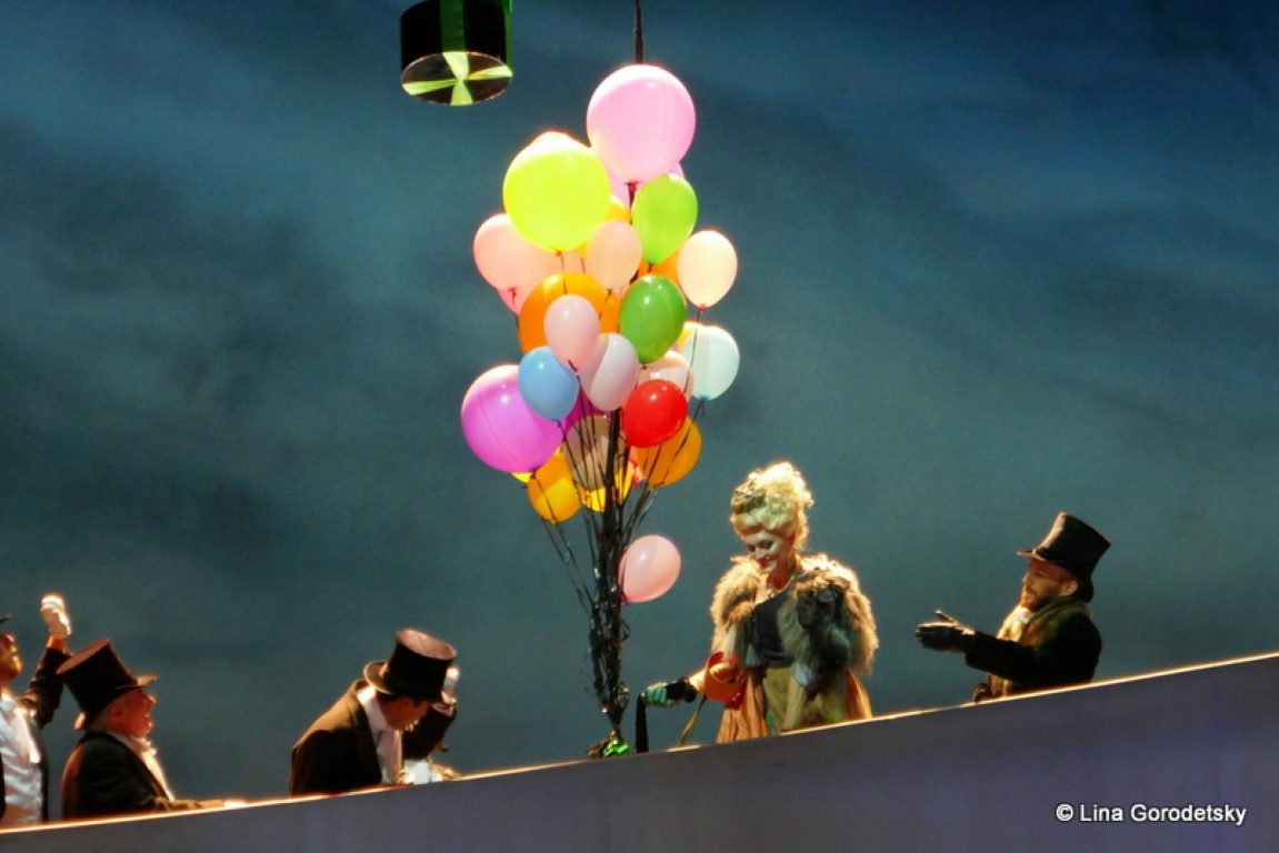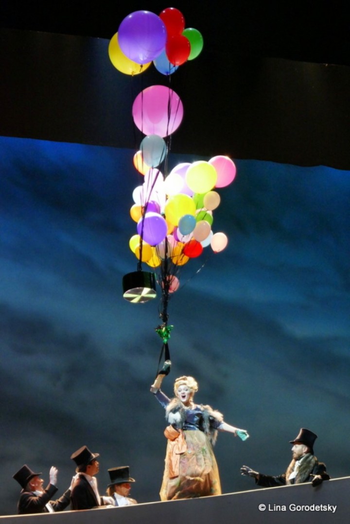 Ну а сама постановка, это море эмоций! Это интересные находки, это оригинальные костюмы и декорации. А идея с зеркальным полом и стенами — победа над рутиной, которой иногда становятся оперные постановки. А яркие шары, которые украшают «небо», а комические эпизоды, они оказываются абсолютно уместными в этой невеселой опере.