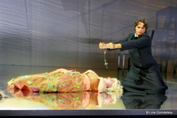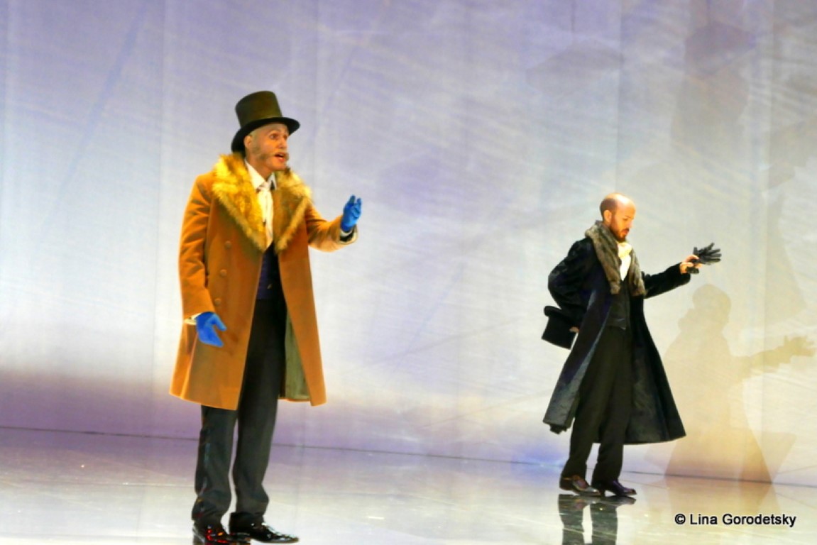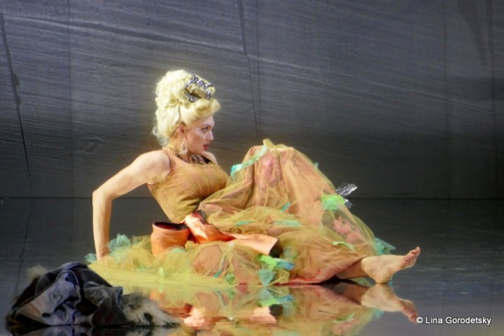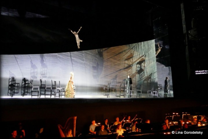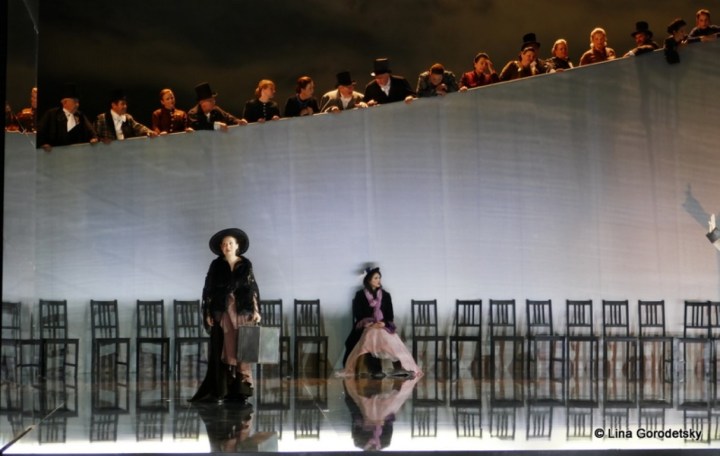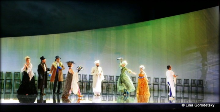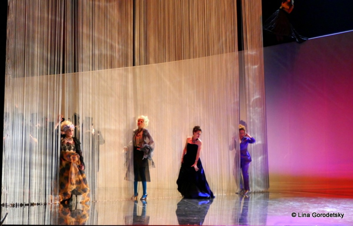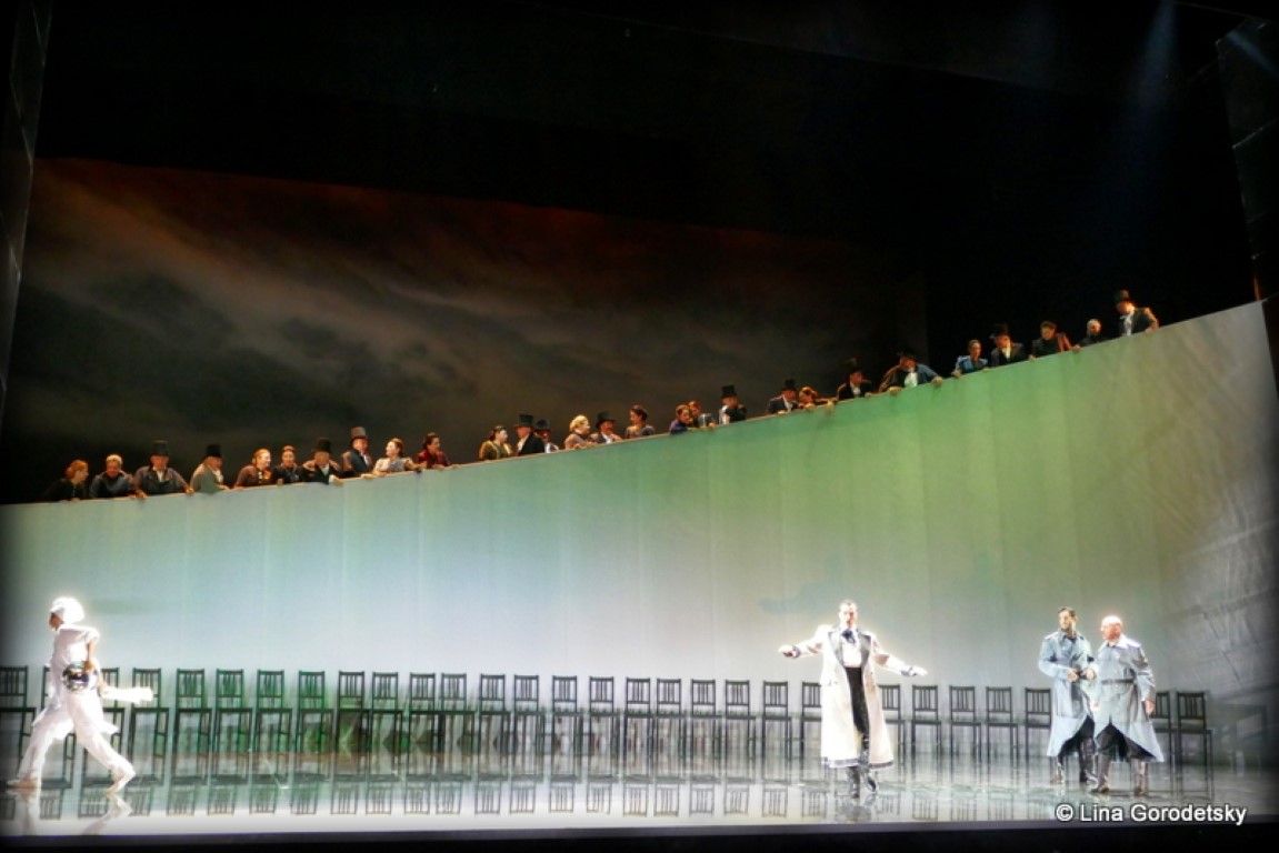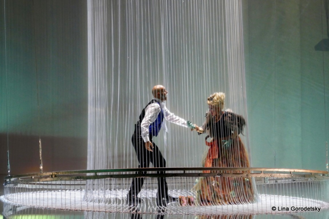 Ну а сама постановка, это море эмоций! Это интересные находки, это оригинальные костюмы и декорации. А идея с зеркальным полом и стенами — победа над рутиной, которой иногда становятся оперные постановки. А яркие шары, которые украшают «небо», а комические эпизоды, они оказываются абсолютно уместными в этой невеселой опере.