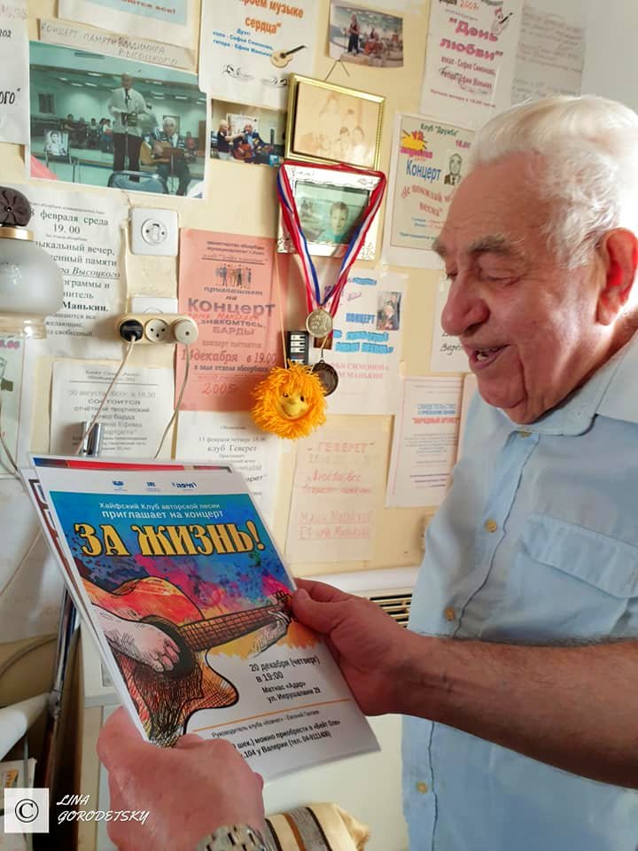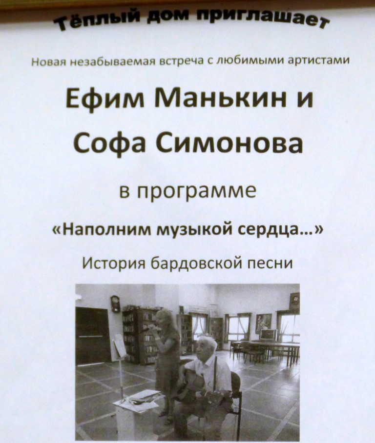 А пока привет от хайфского КСП ему был доставлен бардом Олегом Фабия, многолетним участником  деятельности «Ковчега». Олег привез концертные афиши прошлых выступлений, очень обрадовав ими Ефима Петровича. А когда Олег экспромтом подобрал музыку к стихам Манькина и исполнил на гитаре, нужно было видеть, как зажглись глаза Ефима, сколько радости было в них…