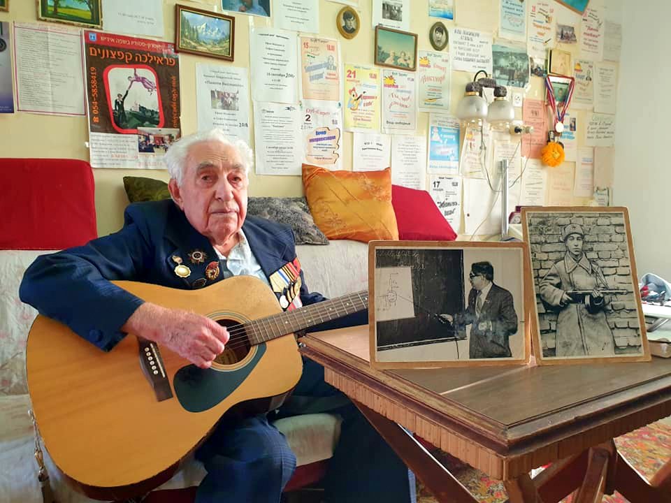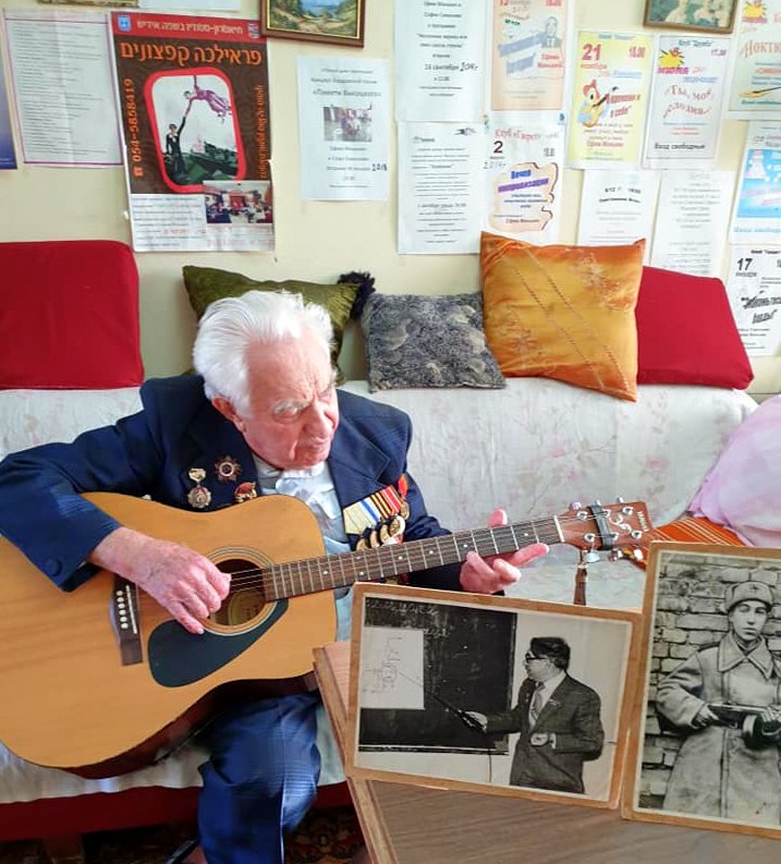 В школе я играл на балалайке, когда мы эвакуировались, балалайка осталась в Белоруссии. Гитара стала родной во время эвакуации, почти восемьдесят лет назад. Один из друзей увлек меня игрой на ней. Я перевел на гитару балалаечные аккорды. А когда попал в армию, на фронт, если было затишье, играл для бойцов. Мы – не пехота, были при транспорте, и гитара была при мне. Если случалось с гитарой что-то, мне раздобывали другую. Важно было бойцам в минуты затишья послушать музыку. В общем, был я таким «Василием Теркиным» в своей бригаде. Пел песни не только на русском, на украинском и белорусском тоже. Тогда, во время войны, я начал писать свои песни. Да только многие из них крамольно звучали. Ребята-солдаты, когда я им пел, выставляли дежурные посты, чтобы успеть сообщить, если приближались офицеры. Но меня никто не предал. Нас было четверо в нашей 37-й бригаде, игравших на музыкальных инструментах. Я, Марат Стеклов, Костя Слепушкин и Борис Вологжанин. Всегда помню их… И после войны гитара со мной всегда. В ровенской школе я не только  преподавал математику и физику, но и руководил струнным оркестром.