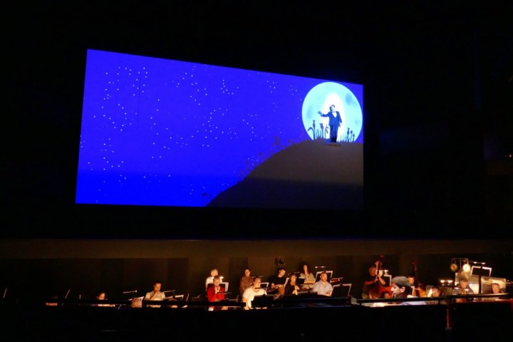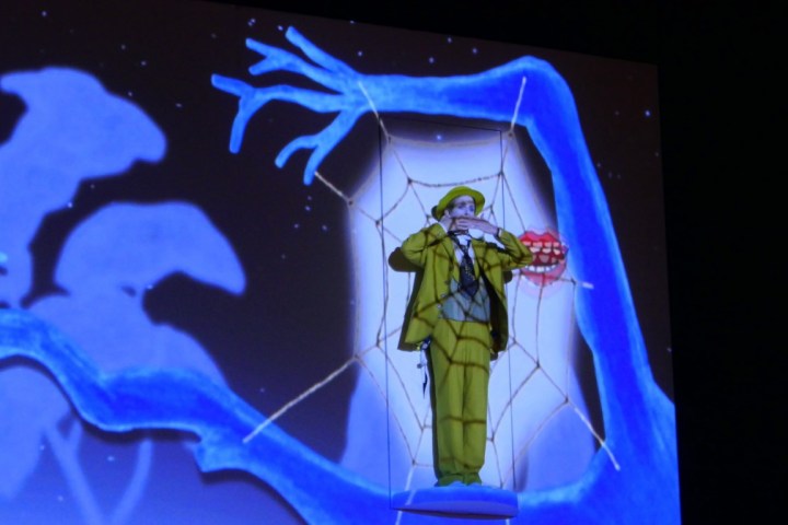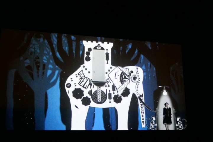 Но как создана эта сказка… Итак, вы приходите в зал, красный бархатный занавес открывается. И вы обнаруживаете, что нет никаких декораций. Совсем! Есть только экран на всю сцену. И наши герои становятся частью занимательнейшего действа, где смешались все жанры. Вы вспомните старые немые фильмы начала прошлого века, а ваши дети и внуки будут без ума от анимационных эффектов, от которых они не смогут оторвать взгляд. Современная же молодежь, глядя на общение главных героев подумает, ну вот же, это настоящая переписка в чате…)))