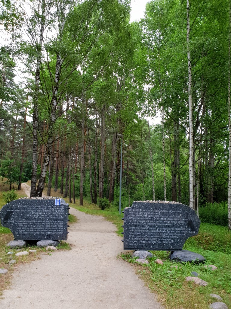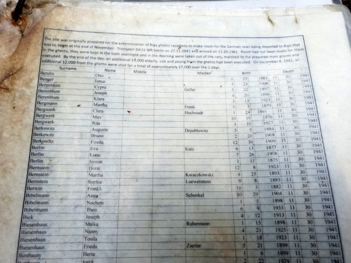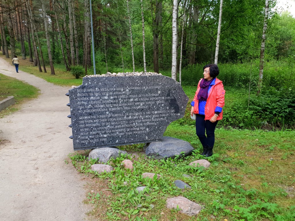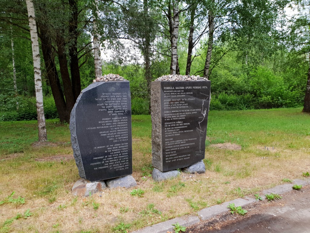 «Здесь, в Румбульском лесу, 30 ноября и 8 декабря 1941 года нацисты и их местные пособники расстреляли более 25 тысяч евреев, заключенных в Рижском гетто — детей, женщин и стариков — и около тысячи евреев, депортированных из Германии. Летом 1944 года здесь были убиты сотни евреев-мужчин из концентрационного лагеря «Рига-Кайзерсвальд».