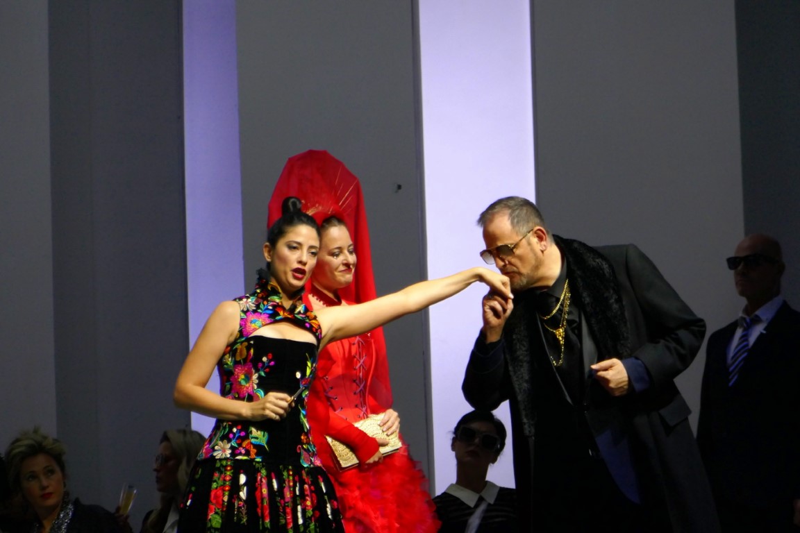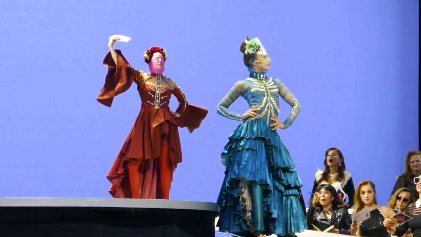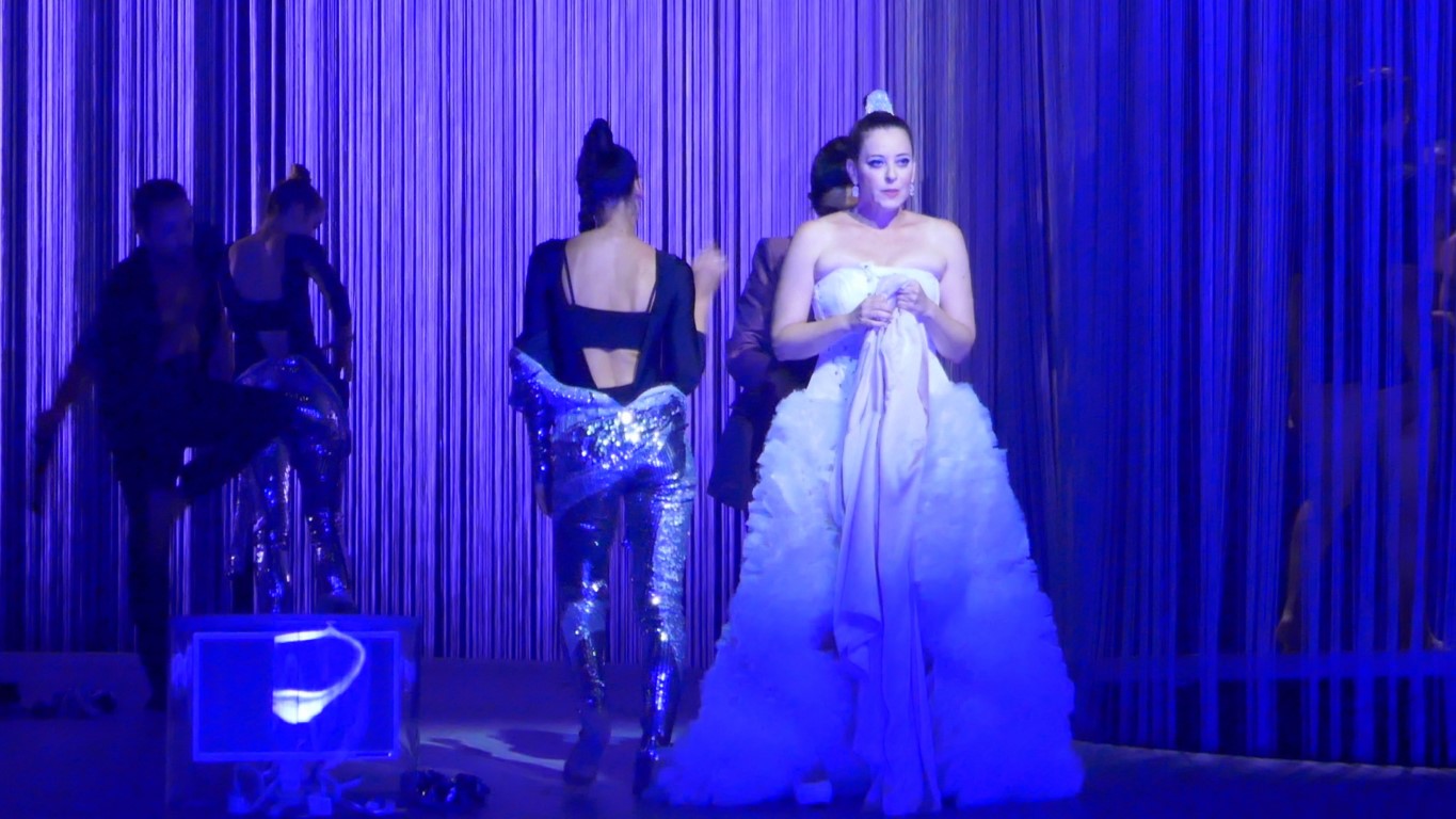 Эта постановка отличается особыми театральными нарядами, дерзкими, яркими, словно сошедшими с подиума показа мод. Так и было задумано. И сотрудничали с театром для этого дизайнеры израильского дома моды Factory 54.
