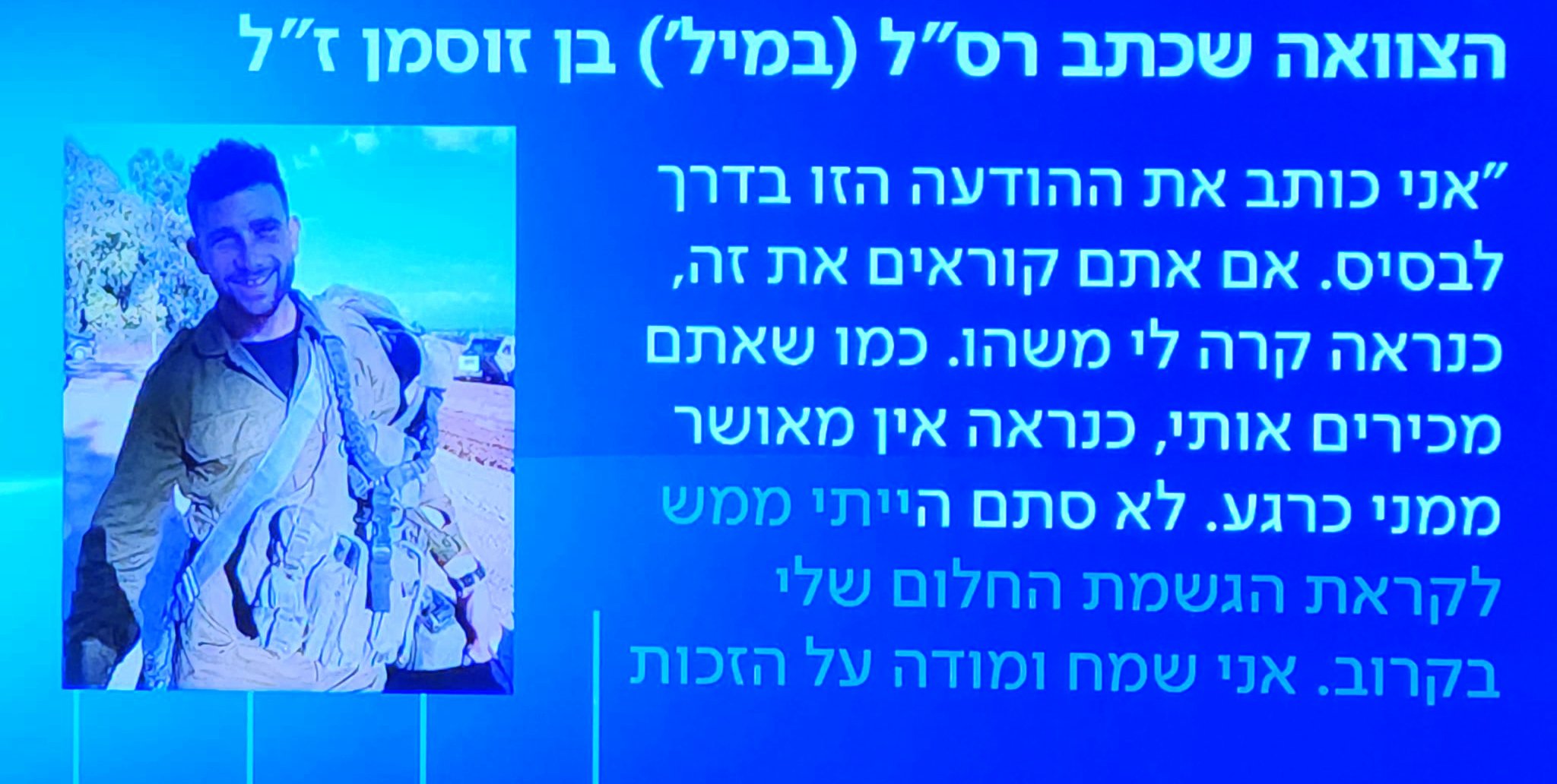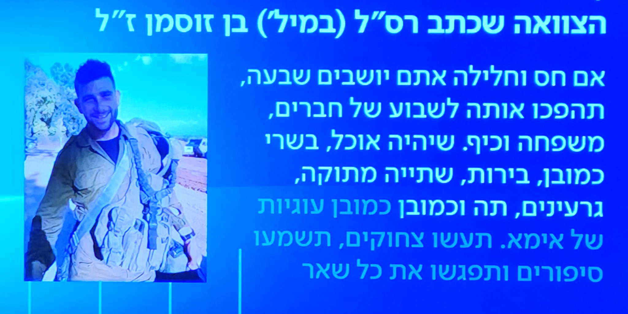 Это была Сарит Зусман. И звучало письмо Бена, ее мальчика 22 лет, его завещание родным и друзьям. Впрочем, не мальчика… старшины запаса Бена Зусмана, бойца 601-го военно-инженерного батальона «Асаф» 401-й бронетанковой бригады «Иквот ха-Барзель».