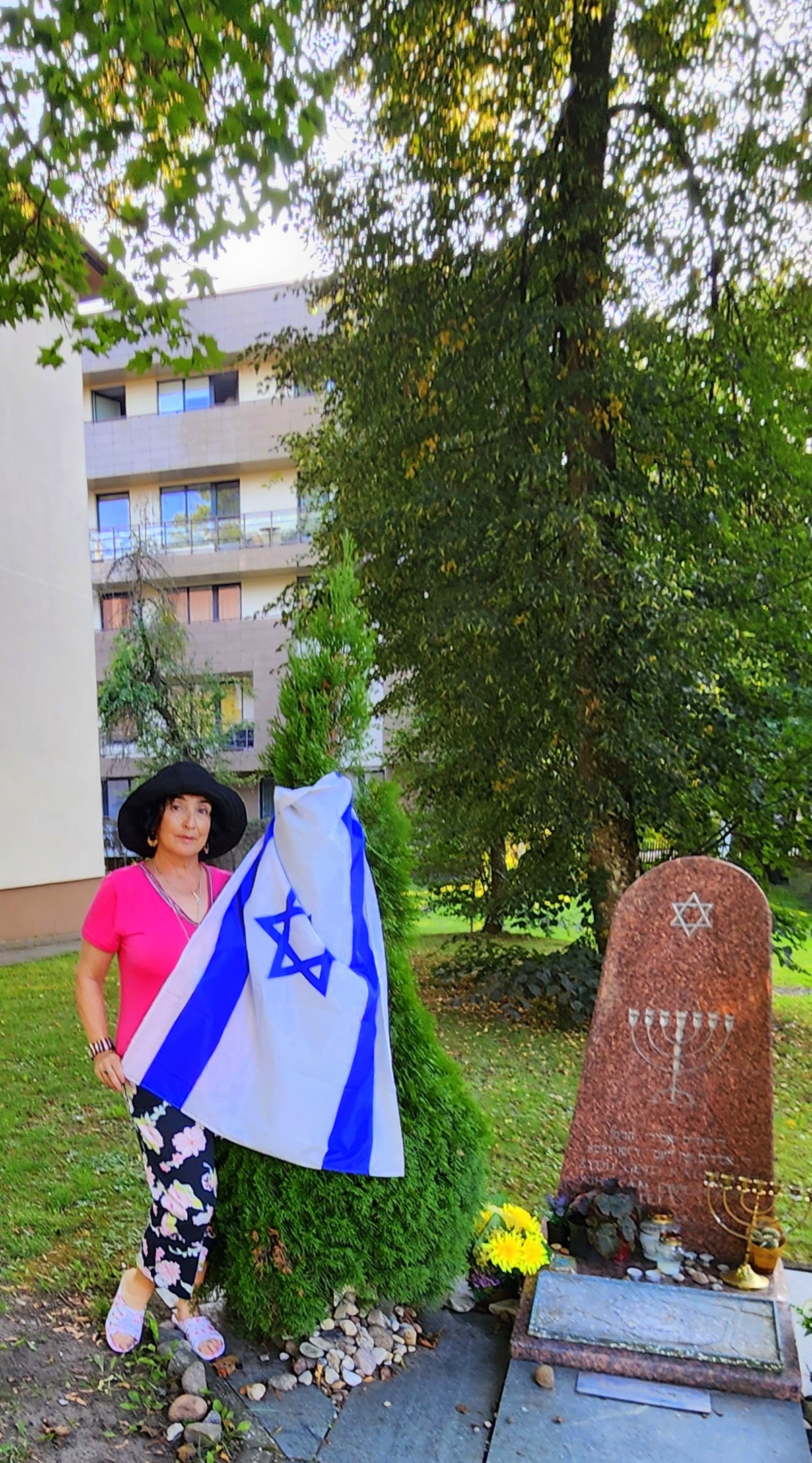 Знаете, это удивительно трогательно в чужой стране, в чужом городе прикоснуться к родному флагу. И стоит там памятник погибшим евреям города Друскининкай. В тот раз я просто постояла рядом. Кто-то их отдыхающих израильтян увидел меня, тоже растрогался и предложил сфотографировать.