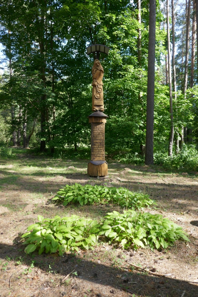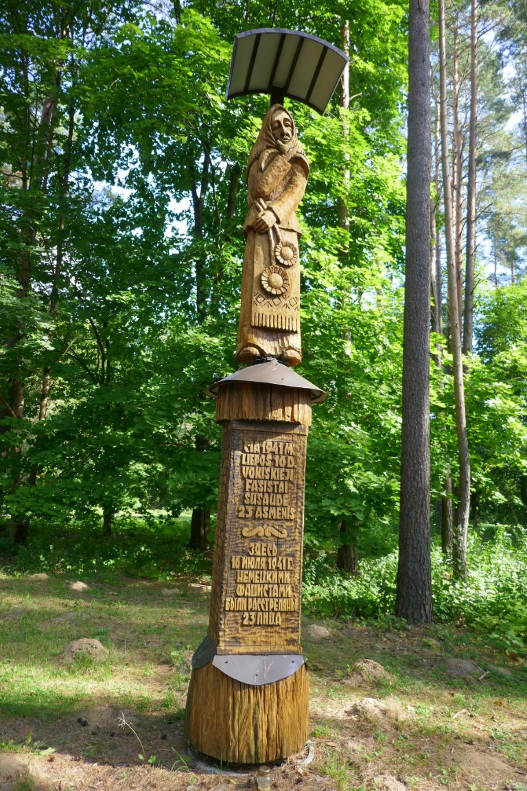 И еще один знак – память о еврейской общине. Это памятник расстрелянным в лесу жителям города. Буквально через три недели после оккупации. В том лесу, где находится музей леса и множество деревянных скульптур, одна скульптура стоит поодаль. К ней меня привели, новые знакомые, Татьяна и Владимир, они в свое время открыли для себя это место.