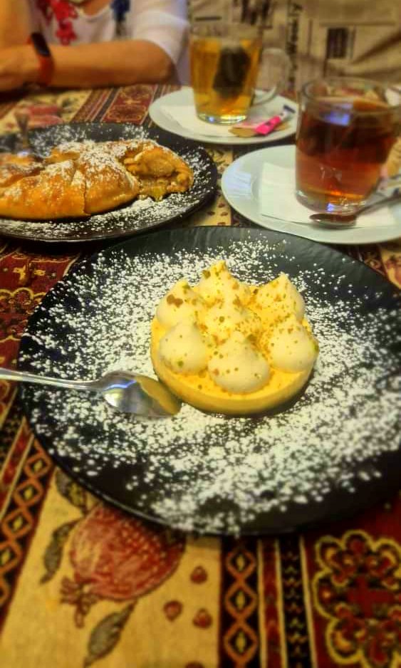 Ну, и изюминка трапезы. Десерт. Должна сказать, что десерты в ресторане классические. Не национальные. Вкусный «Наполеон» по домашнему рецепту, яблочный пирог, творожный и шоколадный. Но меня покорил пирог лимонный, легкий, воздушный, с приятной кислинкой. После сытного обеда он не оставляет чувство отягощения, и это здорово.