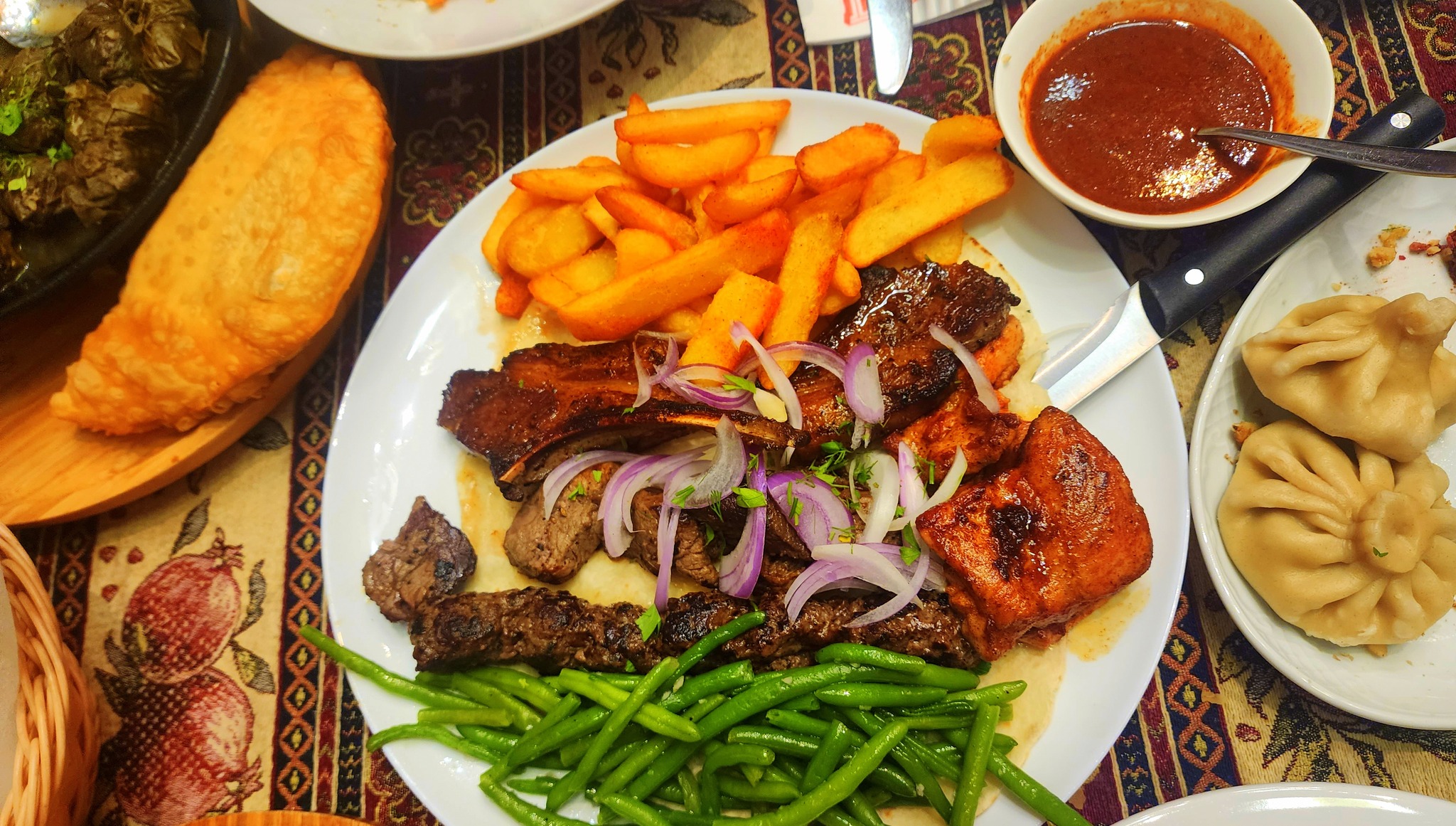 Да, если вы любитель мяса, не в виде начинок, а настоящей вкусной порции натурального мяса, то вам надо обратить внимание на это блюдо. Вернее, сочетание нескольких блюд. Плата, на которой куриный стейк рядом с шашлыком, кебаб — с сочной бараньей отбивной, и все это гастрономическое роскошество окружено запеченным картофелем и зелеными стручками фасоли.
