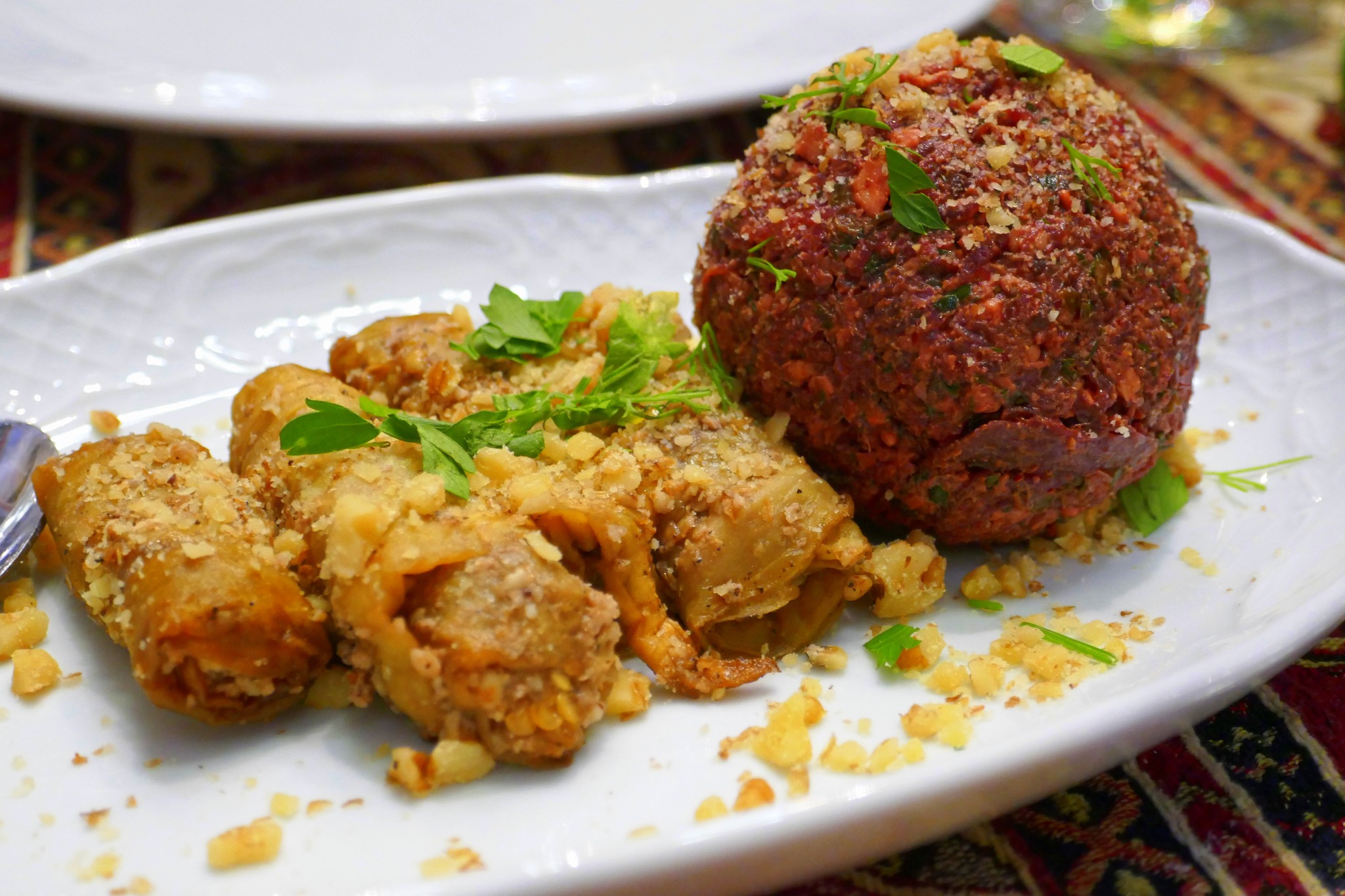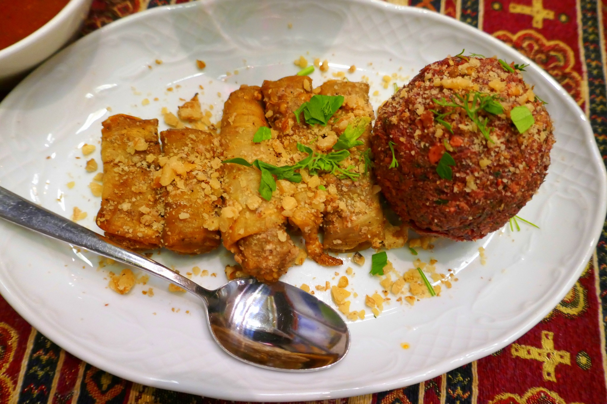 А кроме салата, мы заказали трубочки из баклажан, начиненные орехами. И к ним получили свекольный шарик. Несколько лет назад мне повезло побывать в Грузии, так что есть некий опыт не готовить, но отведывать блюда грузинской кухни.