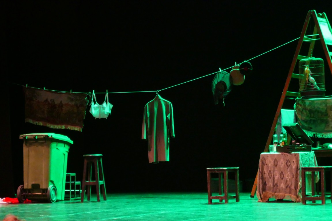 Ничего лишнего на сцене. Все очень понятно и символически. И веревки, на которых сушится белье. Настенный Коврик с «тремя богатырями». И с оленями. Помните таких? Клетка с птицами. Зонтики… Да, зонтики особенно меня покорили. Японские соломенные зонты. Такой был у моей молодой мамы, есть на фотографии. А потом родилась я и сломала его. Я вообще много чего в детстве сломала. О чем моя мама вспоминала еще много лет…